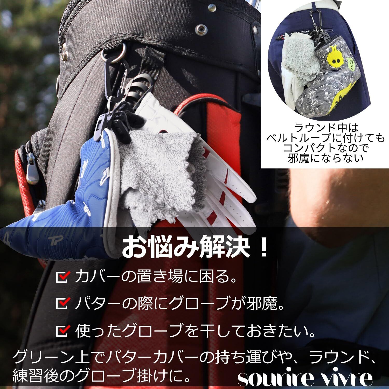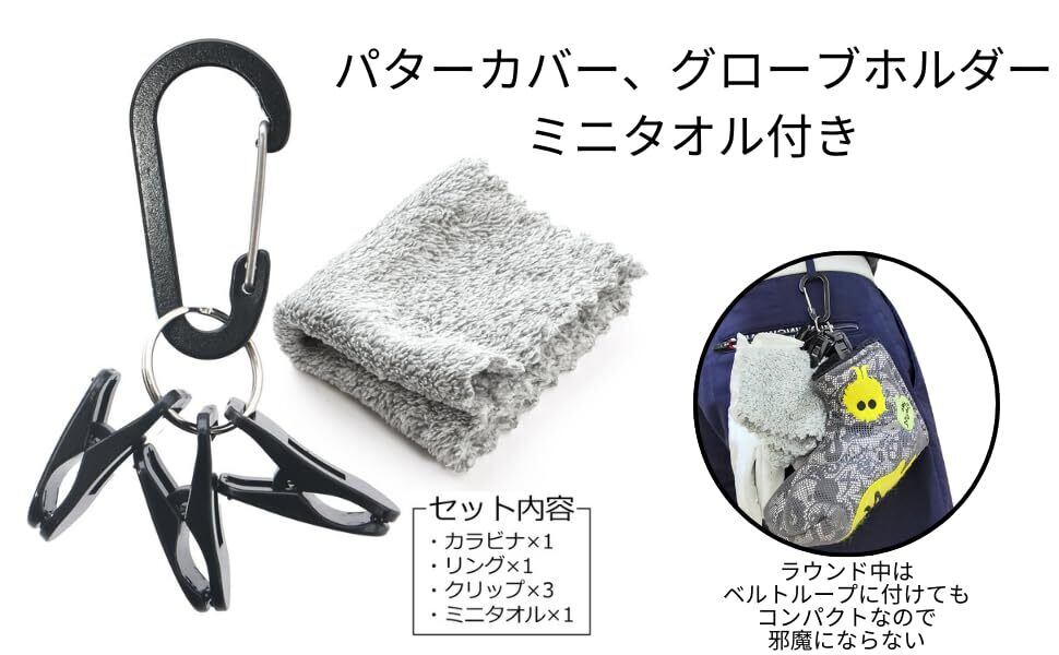 [sourire vivre] パターカバーホルダー グローブホルダー あると便利なミニタオル付き 開口部10mm大口径強クリップ 取外し簡単 ゴルフ パターカバーキャッチャー