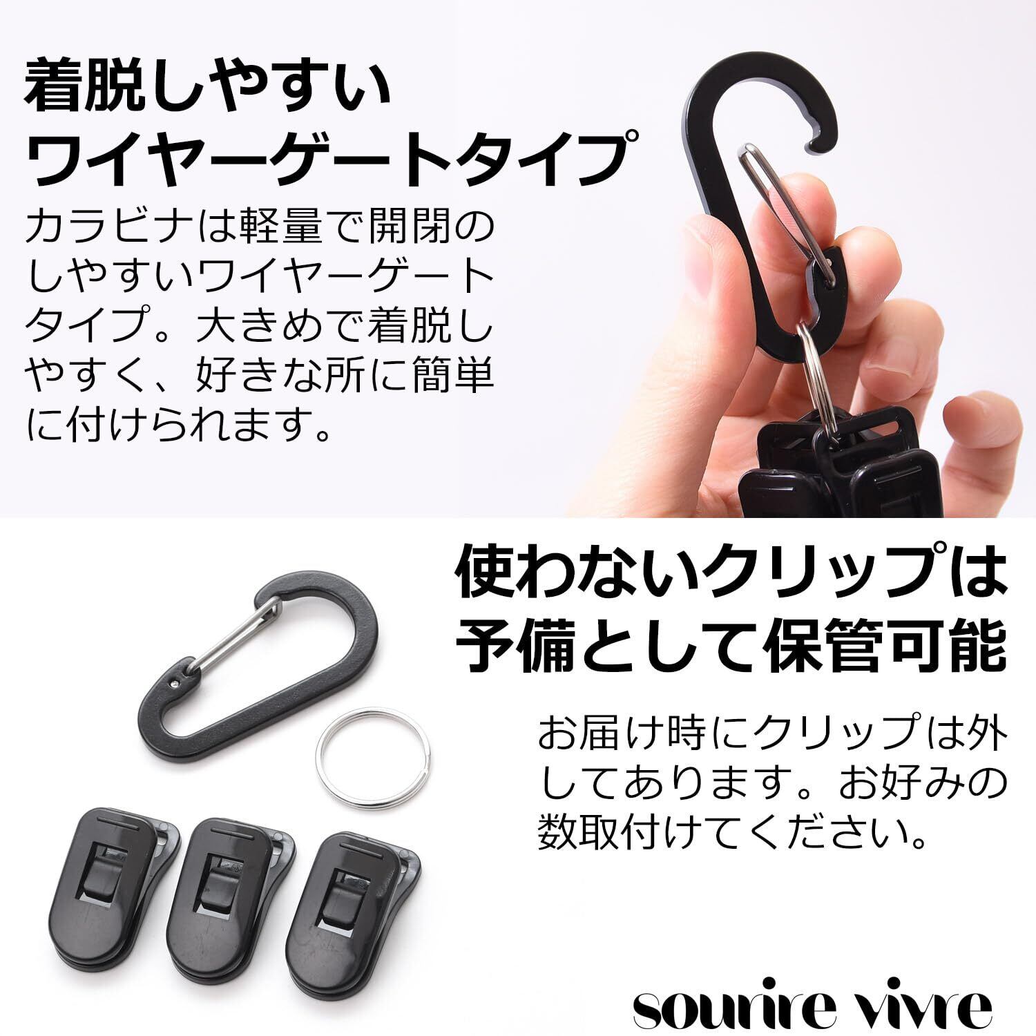 カラビナは軽量で開閉のしやすいワイヤーゲートタイプを使用しているので装着時の負担も軽減します。