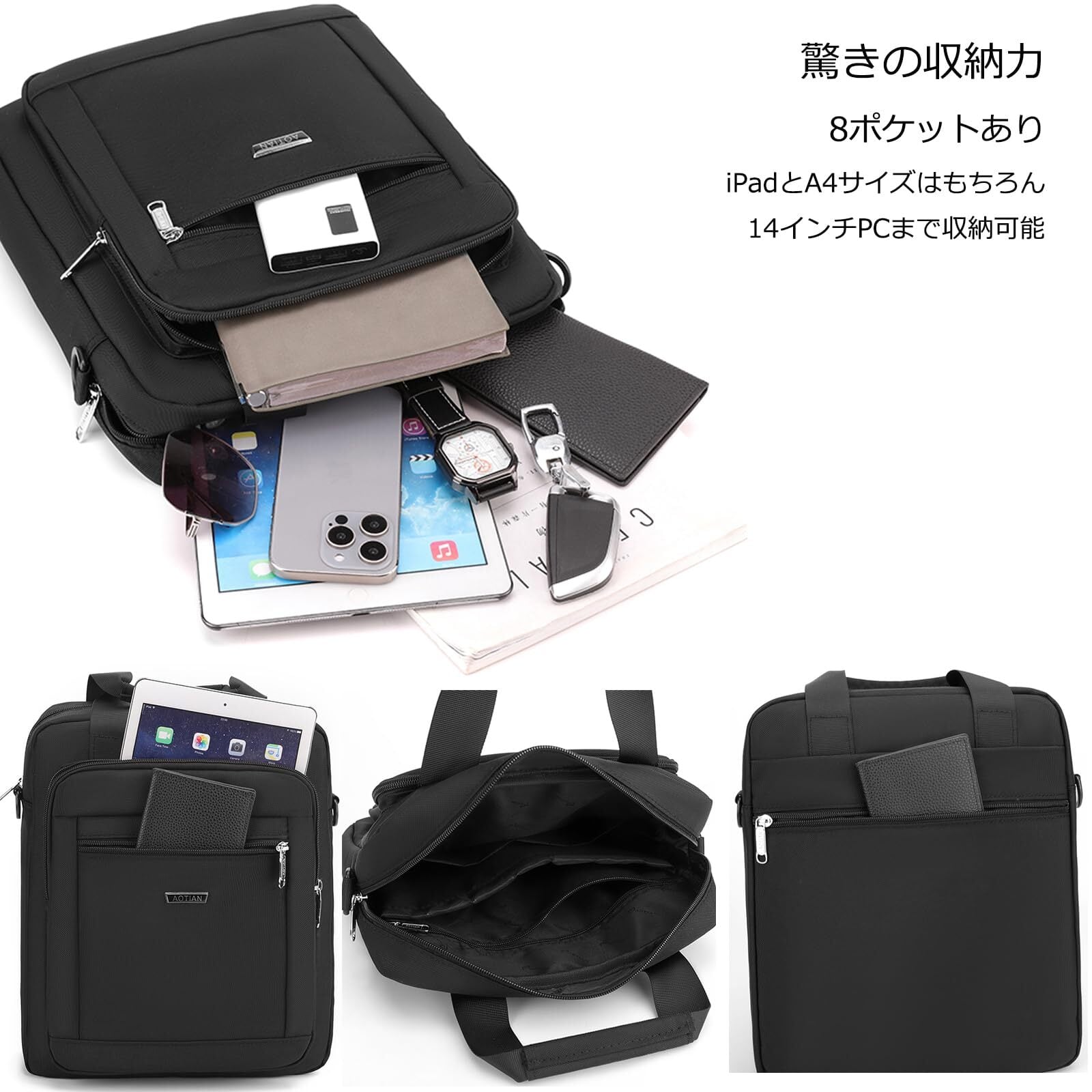 【たっぷり大容量&8ポケット】A4サイズの書類は勿論、ビジネスには必要の14型ノートPC(サイズ32*23cm、超えると入らない可能性がある)も楽々入る大容量の斜めがけバッグです。ポケットも多く、整理しやすくて、手帳、スマートフォン、折り畳み傘、財布など必要な物が十分入るからこれ一つでお出かけ可能です。