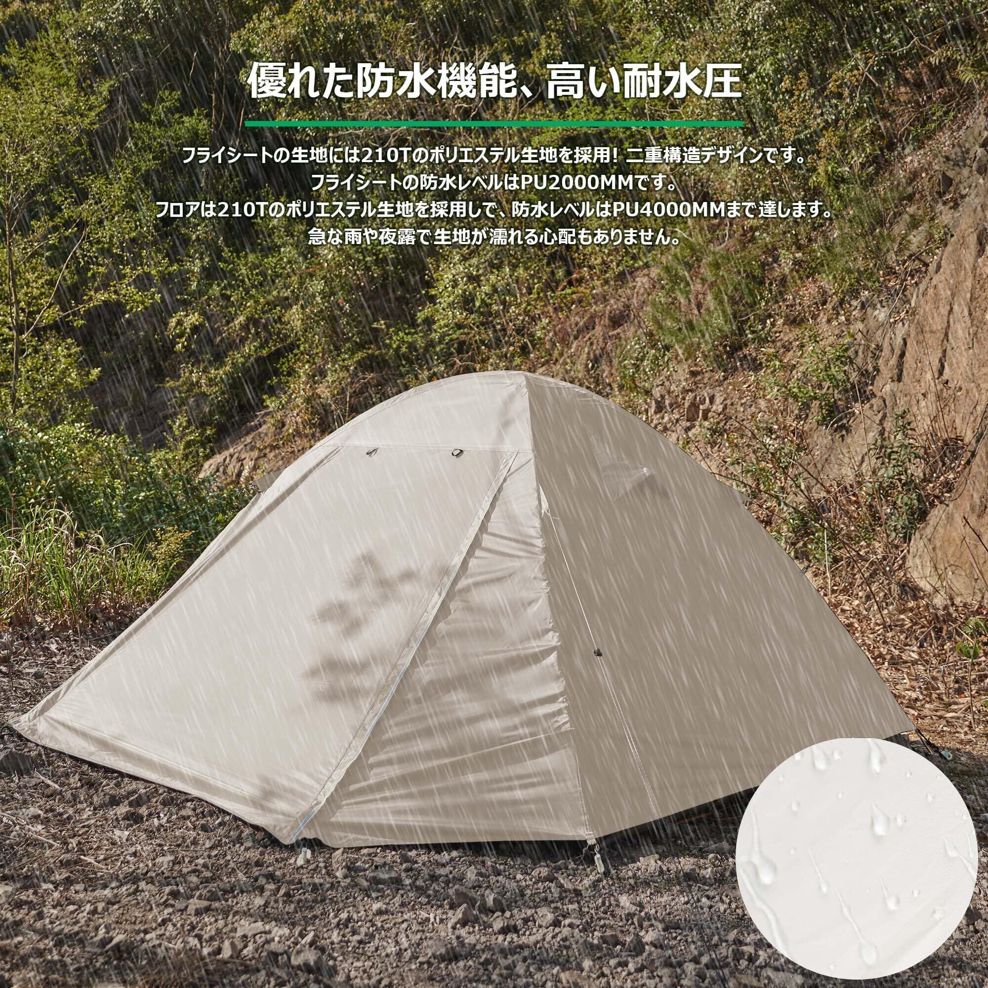 【高品質の素材】フライシートの生地には耐久性に優れた210Tのポリエステルを採用し、シルバーコーティングが施されてるため、優れたUPF50 +紫外線UVカットで、真夏の日差しから肌をよく守ってくれる。PU2,000mmの耐水圧を備えて、突然の雨にも対応が可能。耐風性があり、風の影響も最小限となり。いかなる天候にも耐え、色あせやひび割れ、摩擦に強く、強度、耐久性を備えています。