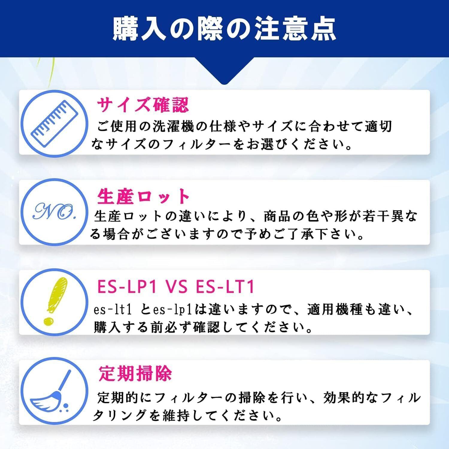 『購入の際の注意点』 ● ご使用の洗濯機の仕様やサイズに合わせて適切なサイズのフィルターをお選びください。 ●生産ロットの違いにより、商品の色や形が若干異なる場合がございますので予めご了承下さい。それらはすべて使用可能です。 ●定期的にフィルターの掃除を行い、効果的なフィルタリングを維持してください。 アフターサービスについて: お客様の満足が最優先です。商品に不具合がある場合は、ご連絡いただければ迅速に対応させていただきます。 洗濯機用糸くずフィルターで、お家の洗濯をもっと快適で効果的にしましょう!今すぐカートに入れて、新しい洗濯体験をお楽しみください
