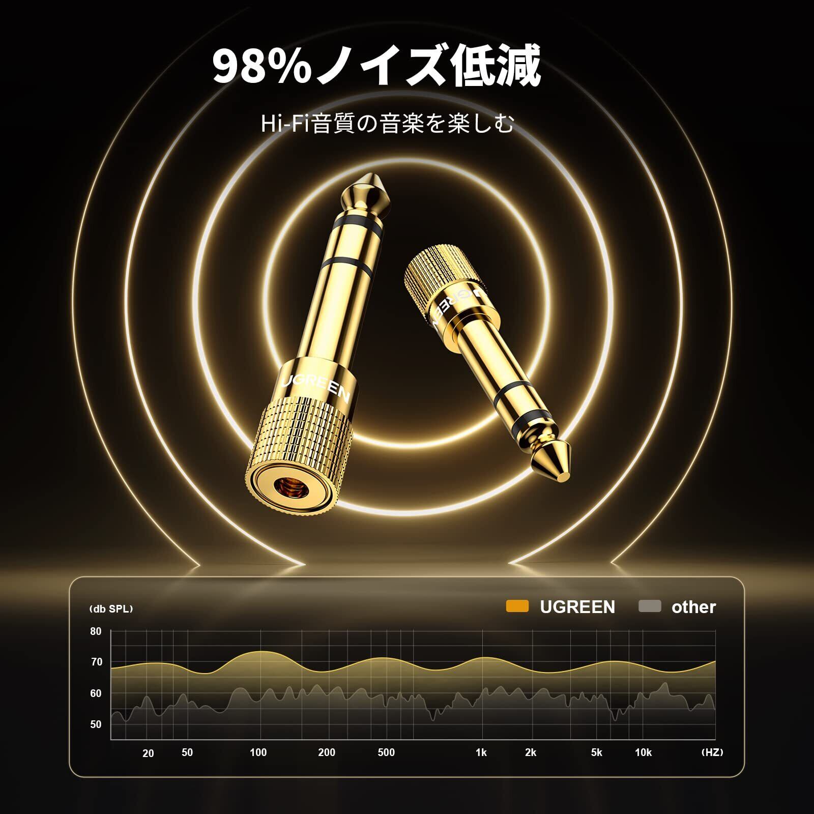 UGREEN 3.5mm ⇒ 6.35mm 変換アダプタ ステレオミニプラグ(メス)⇒ステレオ標準プラグ(オス) 24K金メッキコネクタ 3.5mm to 6.35mm 変換プラグ ヘッドホン/アンプ/電子ピアノ/イヤホン/ミキサー/プレーヤーなどに対応 (1個) | hananoki
