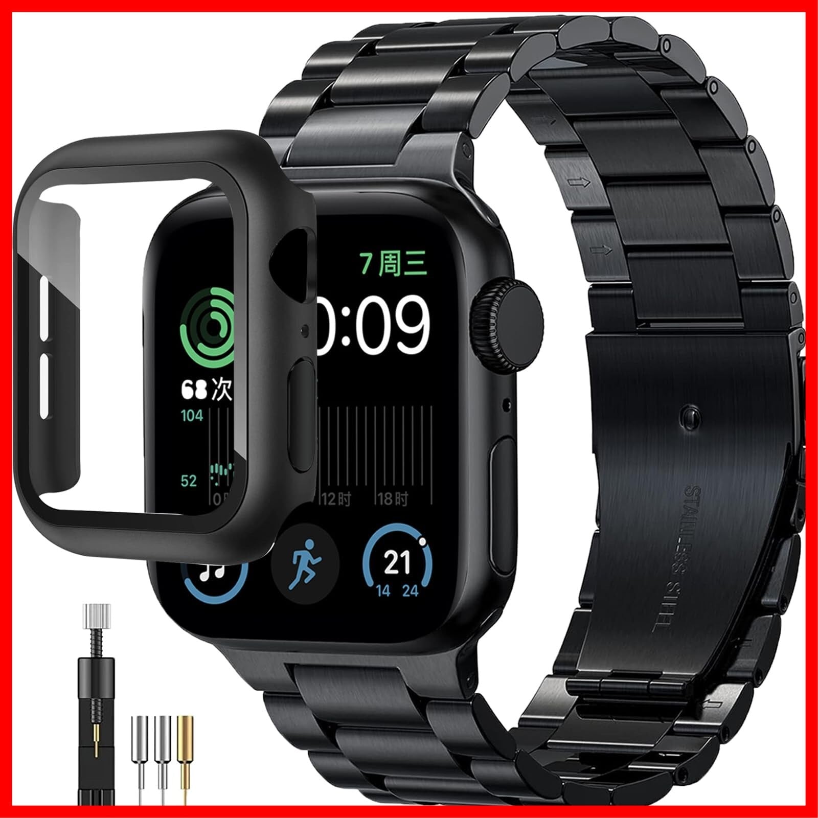 [FALSAD] 新型 Apple Watchバンド ステンレス 46mm/42mm/44mm/40mm/45mm/41mm保護ケース付き 対応 Se/Se2/Series10/9/8/7/6/5/4 アップルウォッチ 交換バンド,iwatch メタル 金属 長さ調整器具付き メンズ レディース兼用ベルト ビジネス 通勤(46mm ブラック) | hananoki