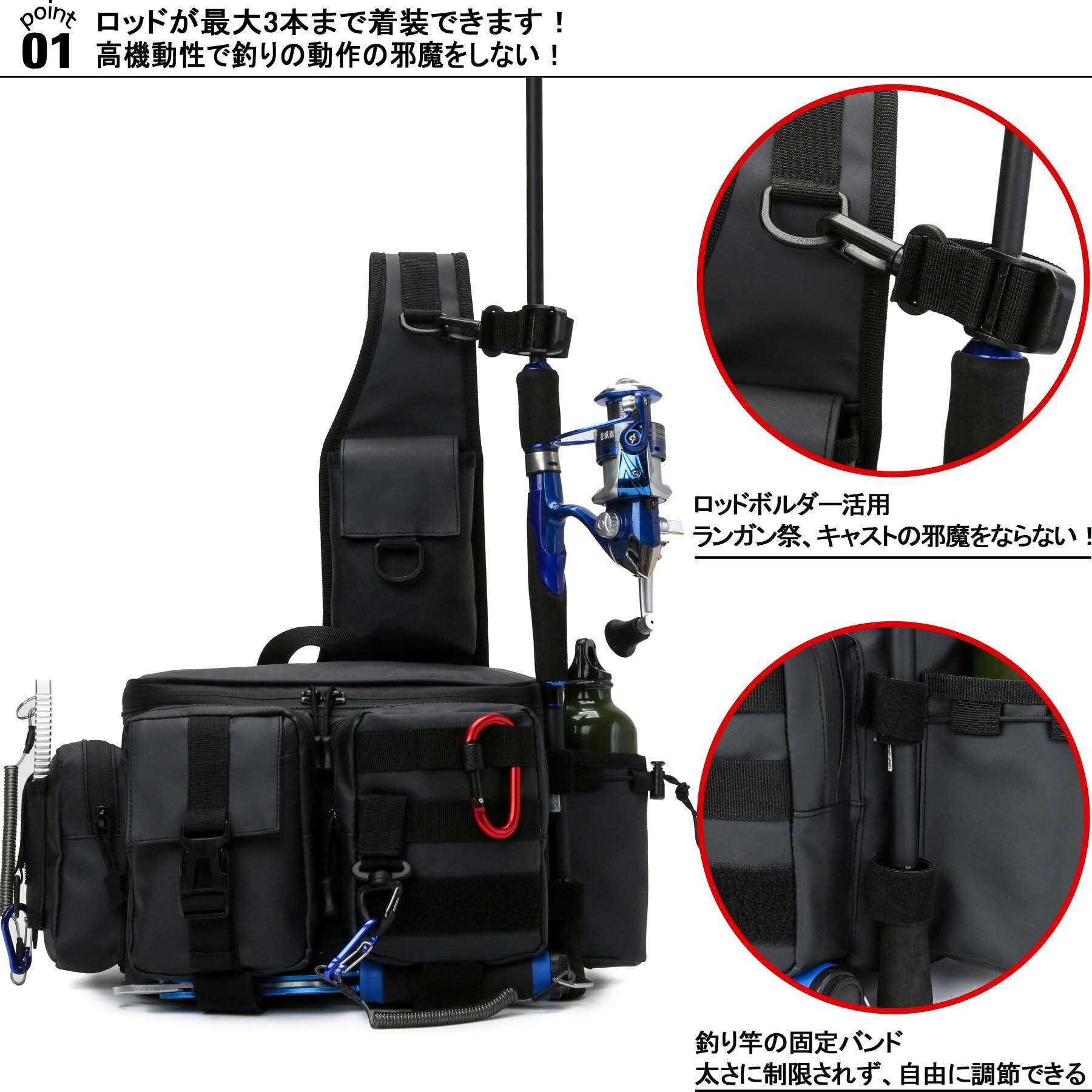 【抜群の撥水性能と耐久性】バッグの生地には600デニールの高品質なポリエステル生地を採用しているため、優れた耐久性を発揮します。撥水加工のスムーズなファスナーを採用して、便利で実用性が高い、防水機能を高めています。雨や水しぶきなどにも強く、あなたの釣り道具を濡れから守ります。体にあたる部分は通気とクッション性を考えたメッシュになっております、汗はかいても、肌を快適に守ります。※撥水または完全防水ではありません。