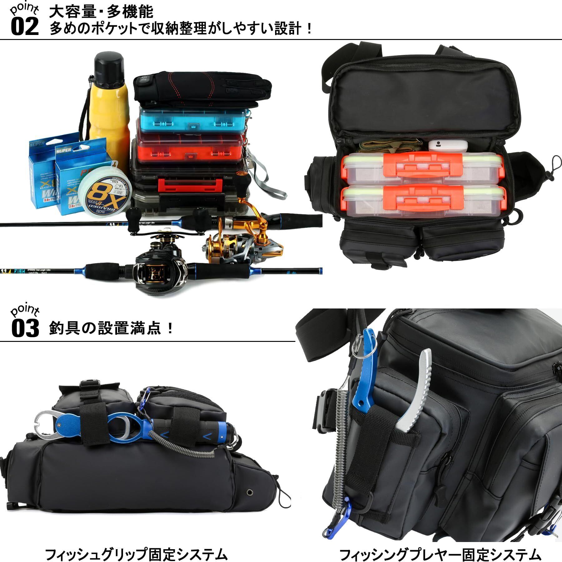 【サイズ詳細】【重さ】約670g【全体サイズ】幅41cm x 縦17cm x 高さ20cm 【メインポケット】30x11.5x20cm【フロントポケット】15.5x12x4.5cmと15.5x12cm【サイドポケット】13.5x9.5x4cm【肩サイドポケット】15x9.5x2cm【カップポケット】直径8cm【大容量】:全開広口ダブルジッパーのメインポケットには中型ボックス(24x12cm程度)が3、4個程度収納可能の釣りばっぐ。ペットボトル、ペンチ、プライヤー、フィッシュグリップを収納する嬉しい専用ポケット。フィッシング専用バッグは多数のポケットを装備しみんなさんの快適な釣りをサポート。(ショルダーベルトは35~65/110~140cmまで延長でき、ウエストベルトは50~90cmまで調節できます釣りカバン。)