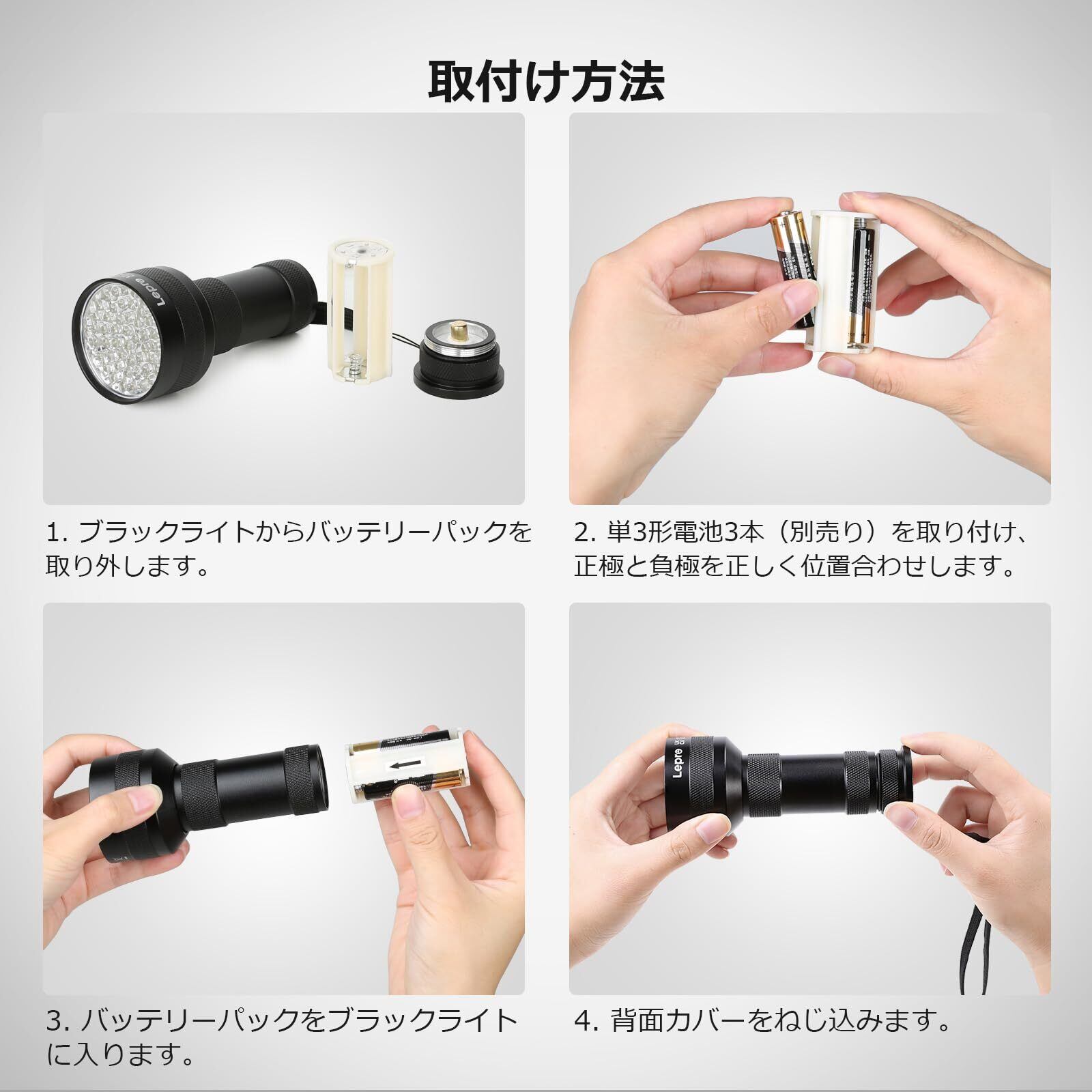 【取扱上の注意】Leproブラックライトは、単3形電池を3本使用します。製品には電池が付属していないため、ご自身でご用意いただく必要があります。●電池を電池パックに取り付ける際は、電池パックの両端にあるプラス極とマイナス極の指示に従ってください。●電池パックを本体に取り付ける際は、電池パックの矢印がLED部分の方向を向くように装着してください。