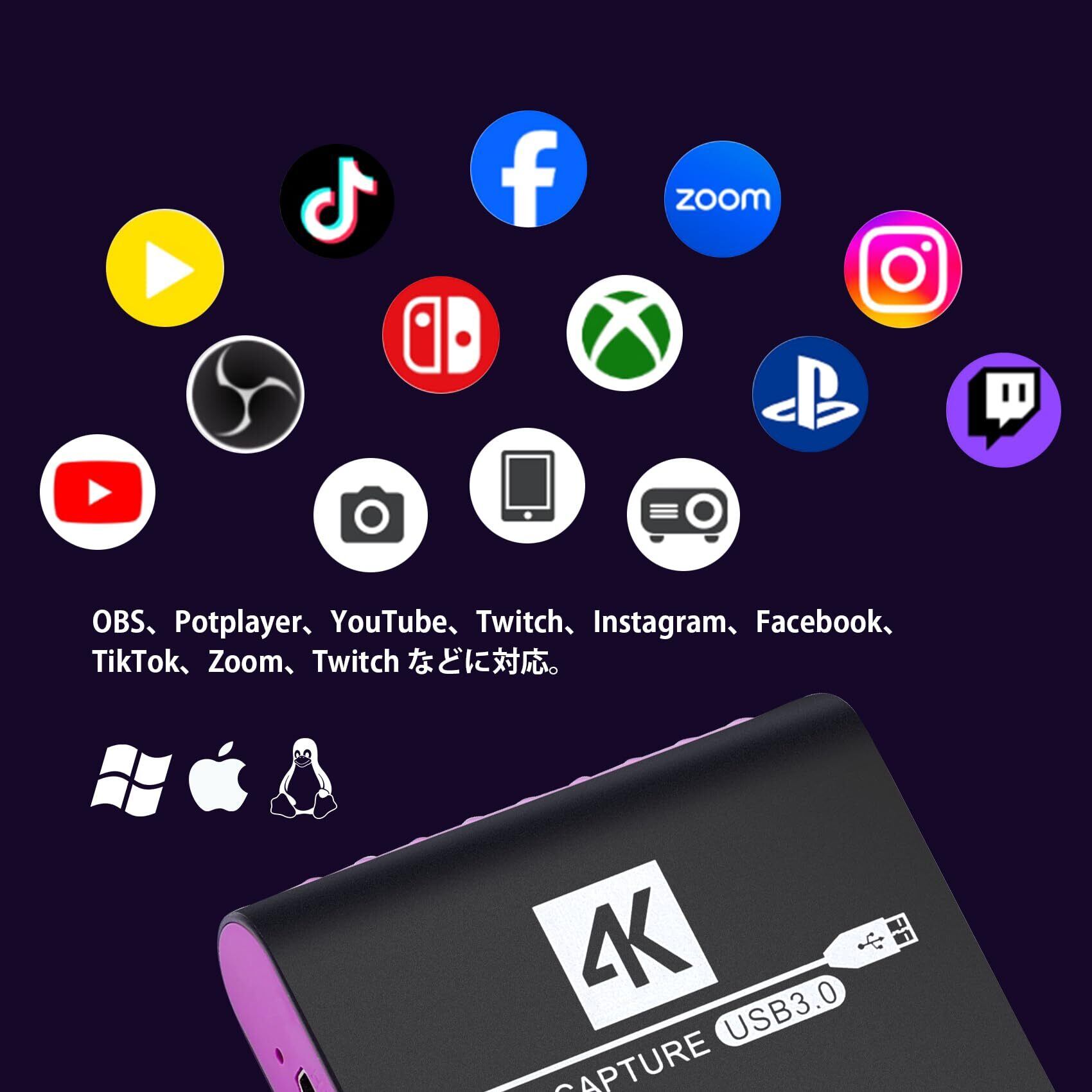 【マルチプラットフォームソフトウェア対応】HDMI キャプチャーボードは、OBS Studio、XSplit、QuickTime Player、Twitch、YouTube、Potplayer、VLC、Instagram、Facebook、Zoom、Teamsなどの主要なビデオ編集およびライブ配信ソフトと完全互換。コンテンツ制作にさらなる利便性を提供します。