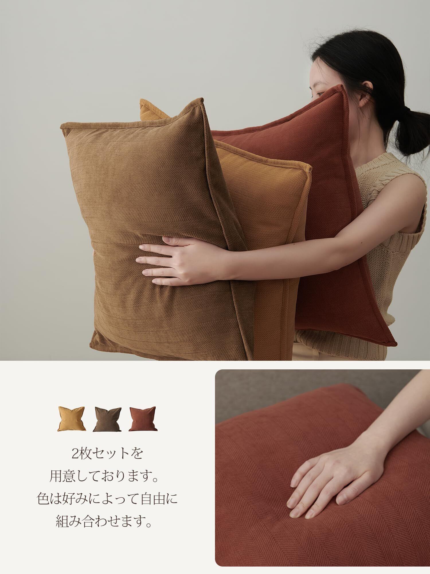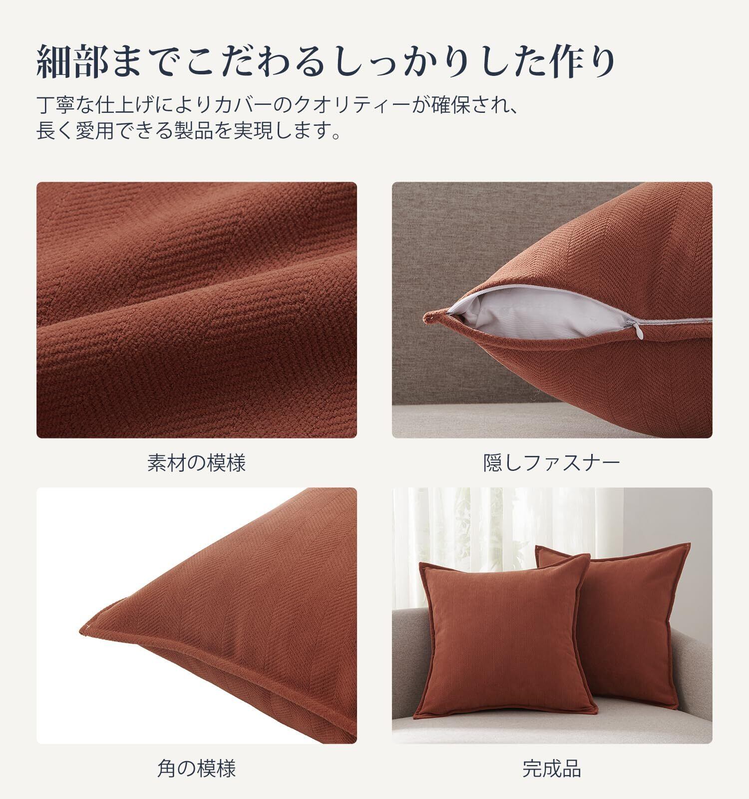 「厳選素材で美しさ長持ち」当社のクッションカバーは、毛玉や色あせ、色落ちを抑える厳選素材を使用。頻繁な洗濯にも耐え、日常使いでも美しさと品質をしっかりキープします。