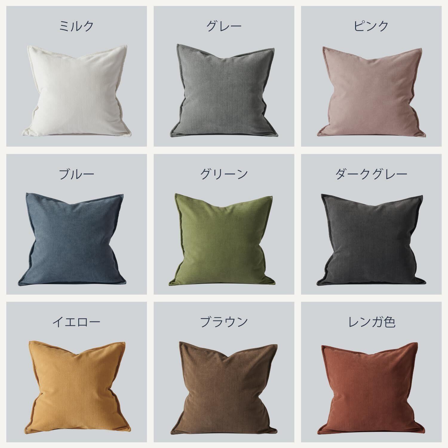 「3サイズ&9カラー展開」45×45cm、50×50cm、60×60cmの3サイズが揃い、様々な用途にぴったり対応できます。さらに、お部屋の雰囲気に合わせやすい9色をご用意しており、お好みに合わせて自由に組み合わせてお使いいただけます。