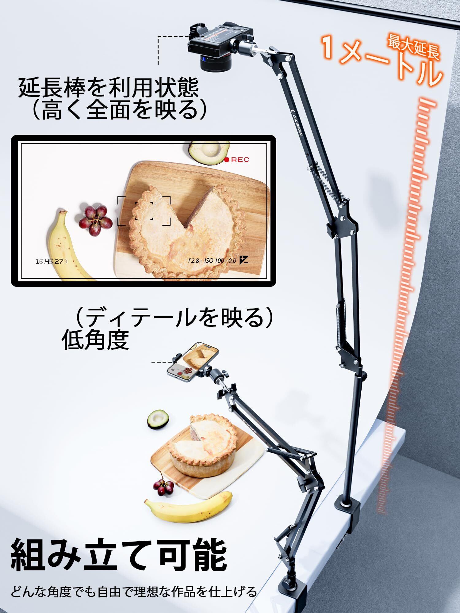 【360°角度自由調整・長く高くなる改良型】 左右上下にかなり柔軟に角度調整することができるスマホ・カメラ両用のアーム式スタンドです。 カメラスタンドが360度自由に回転する構造なので、机の端の方に設置して俯瞰・正対・手元ような形で撮影ができるし、使用しない時は折りたたんでおくことが可能になります。 40cmのアルミ制延長支柱が付属し、高さが調節できる空間が倍増し、真上からの俯瞰撮影は大変便利です。