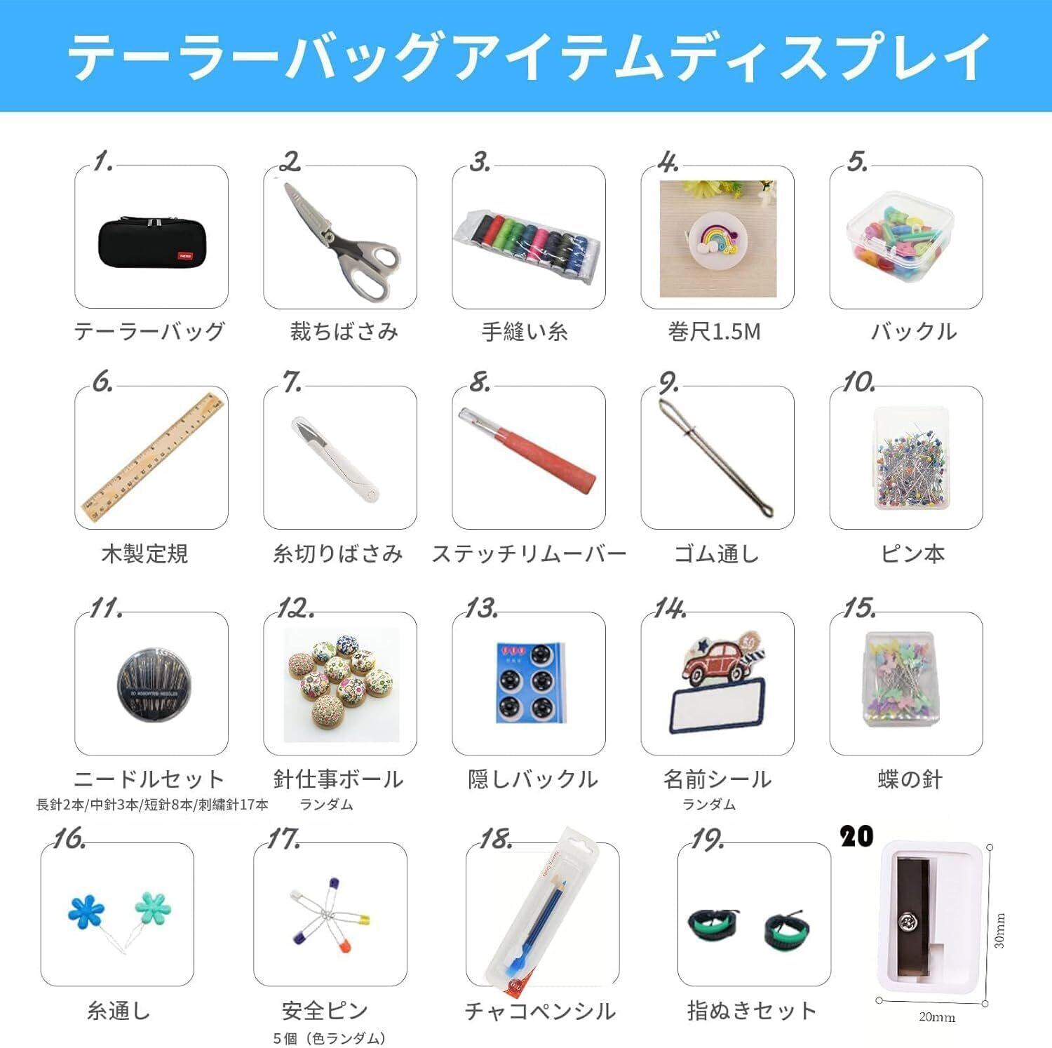 1.裁縫20点セット サイズ:約24×12×7cm 重さ:約530g 2.色違いの裁縫ニーズに合わせた高品質セットです。長さも十分で耐久性もあります。20cmのメジャーはさみ、自動メジャー、糸通し、リッパー、針セット、糸切りなど様々な裁縫用品が含まれています。 3.日本製の高品質21cm裁縫はさみです。小学校で使われる裁縫セットは21cmの裁縫はさみがほとんどです。 4.学用品として最適なサイズです。自宅用だけでなく、旅行、出張、キャンプなどにも使えます。学校の家庭科などの授業の裁縫セットとしてもお勧めです。 5.商品到着後半年以内の初期不良は返品・交換・返金対応可能です。初期不良と確認できた場合には、無償で返品・交換・返金をさせていただきます。