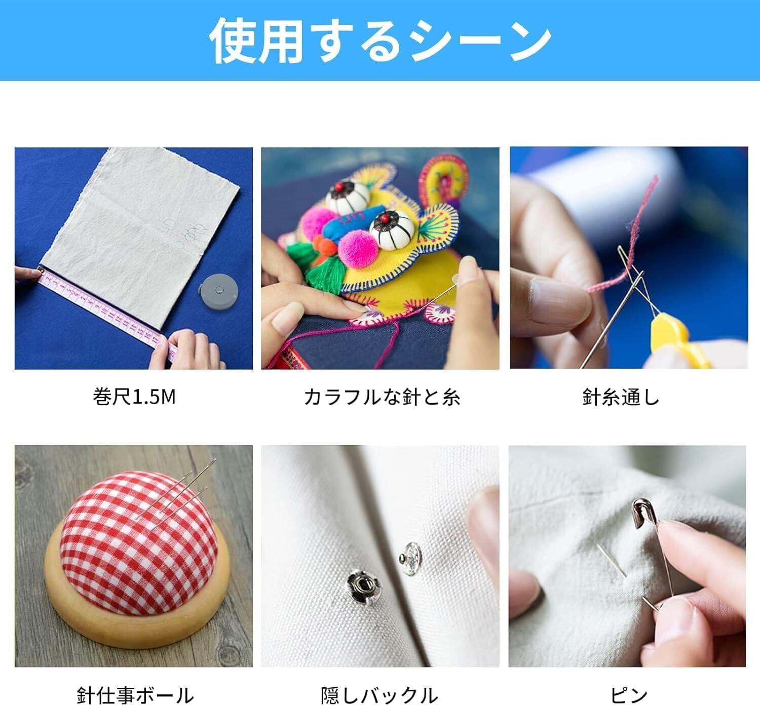 2.色違いの裁縫ニーズに合わせた高品質セットです。長さも十分で耐久性もあります。20cmのメジャーはさみ、自動メジャー、糸通し、リッパー、針セット、糸切りなど様々な裁縫用品が含まれています。