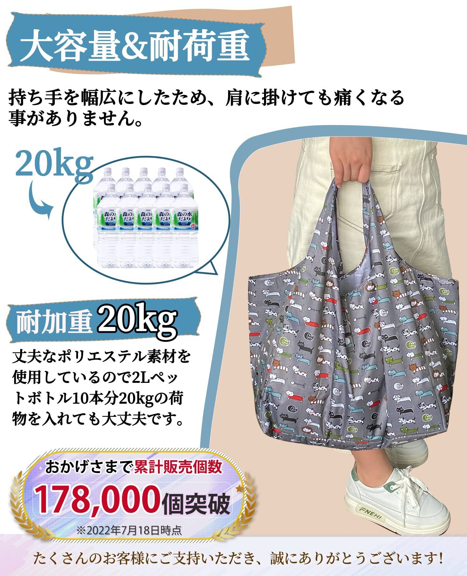 【大容量&耐荷重&畳むサイズ】耐加重20kg、折り畳み9cm x 13cm、広げると長さ35cm×幅23cm×高さ33cmと大容量エコバッグです。 手持ちの部分も幅を広く設計して、荷物持ち時の負担を減らすためです。 丈夫なポリエステル素材を使用しているので2Lペットボトル10本分20kgの荷物を入れても大丈夫です。 大きめのサイズのため、沢山買い物しても余裕を持って入ります。また、持ち手を幅広にしたため、肩に掛けても痛くなる事がありません。そのため旅行の補助バックとしても使えます。