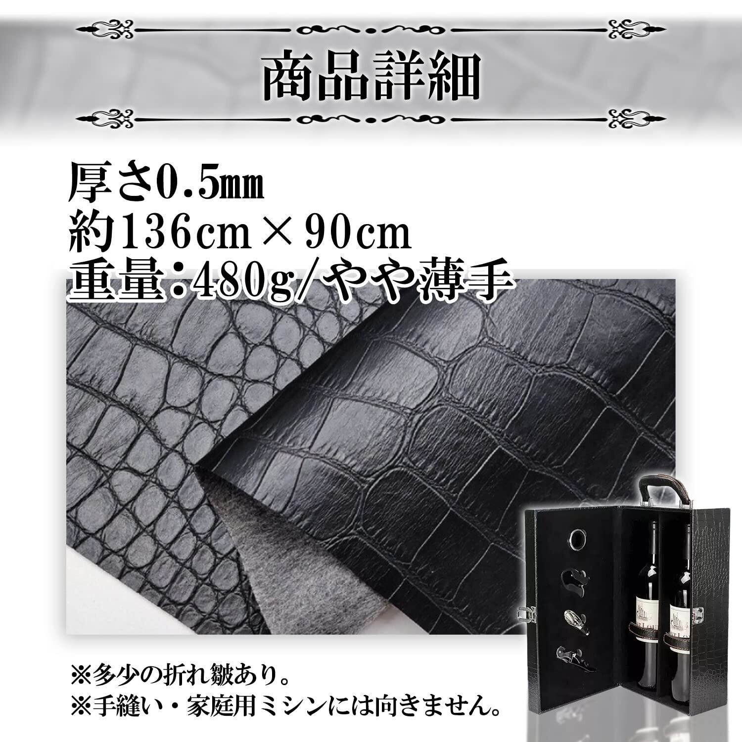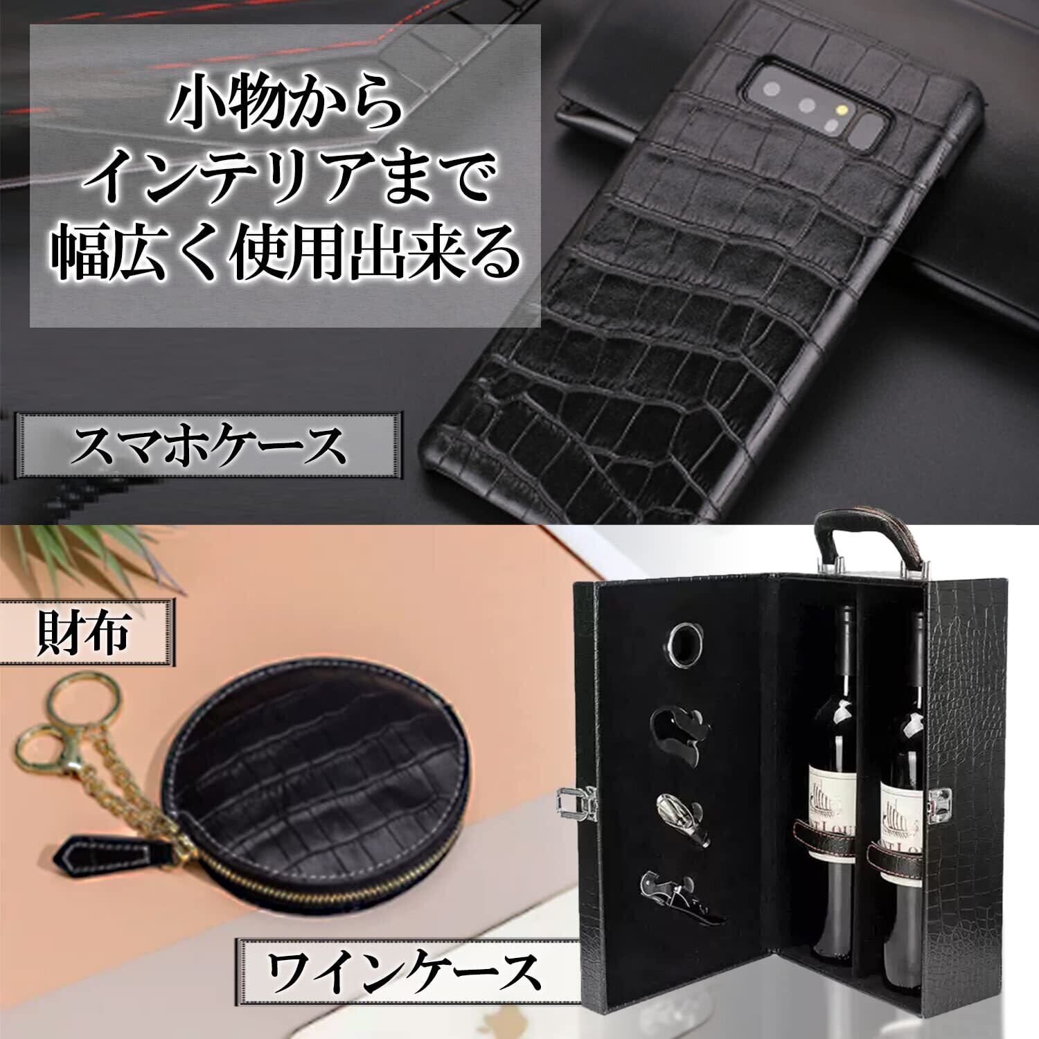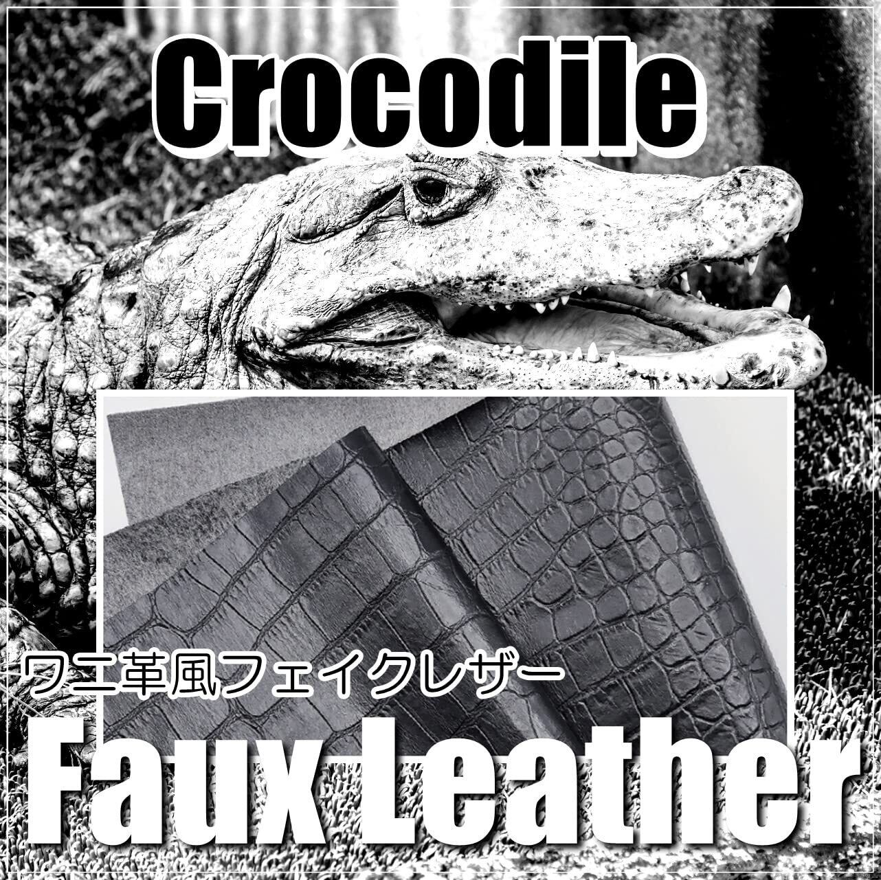 クロコダイルレザー風のPVC皮革になります。上品でマットなブラックが美しい生地は、様々なシーンで用途があります。