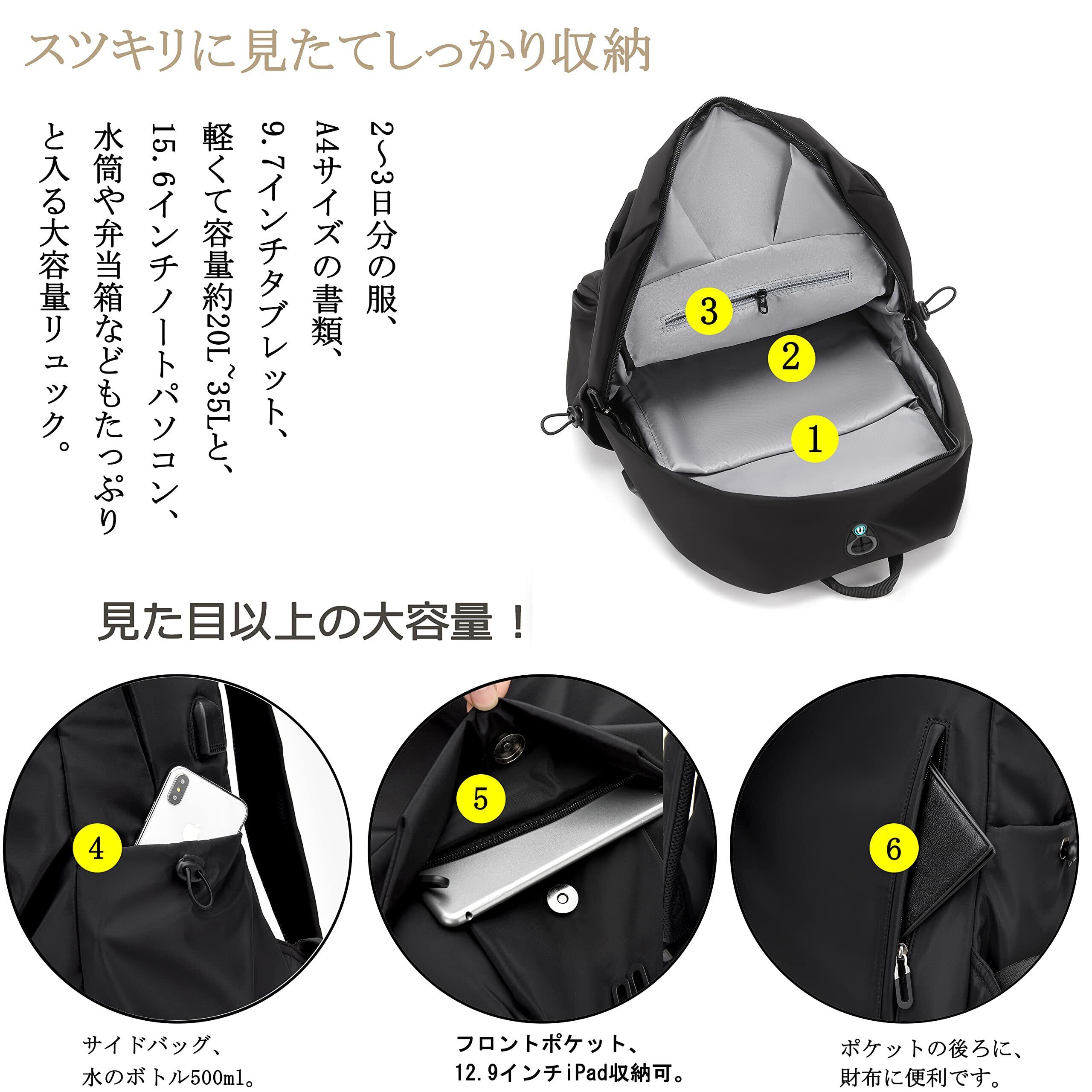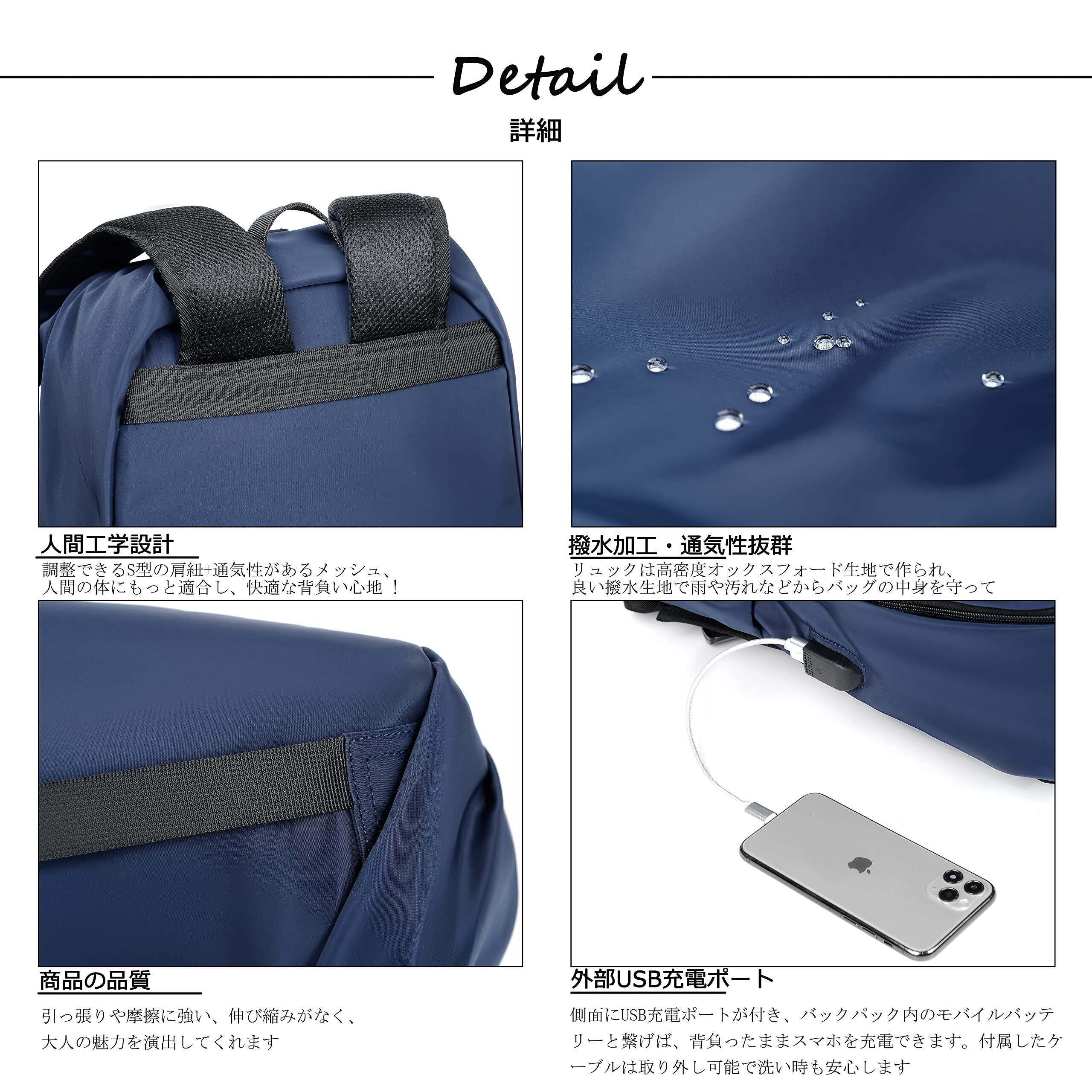 【軽量で大容量/USB充電ポート】収納力は十分にあり。A4サイズ、PC、教科書、傘、衣類、飲み物、お弁当、重い荷物を入れても安心感あり。通学や通勤や旅行や出張などにおすすめです。※バックパックの側面にUSB充電ポートあり、お手元のスマトホンを充電できます、気楽に片手で携帯電話が使えます。
