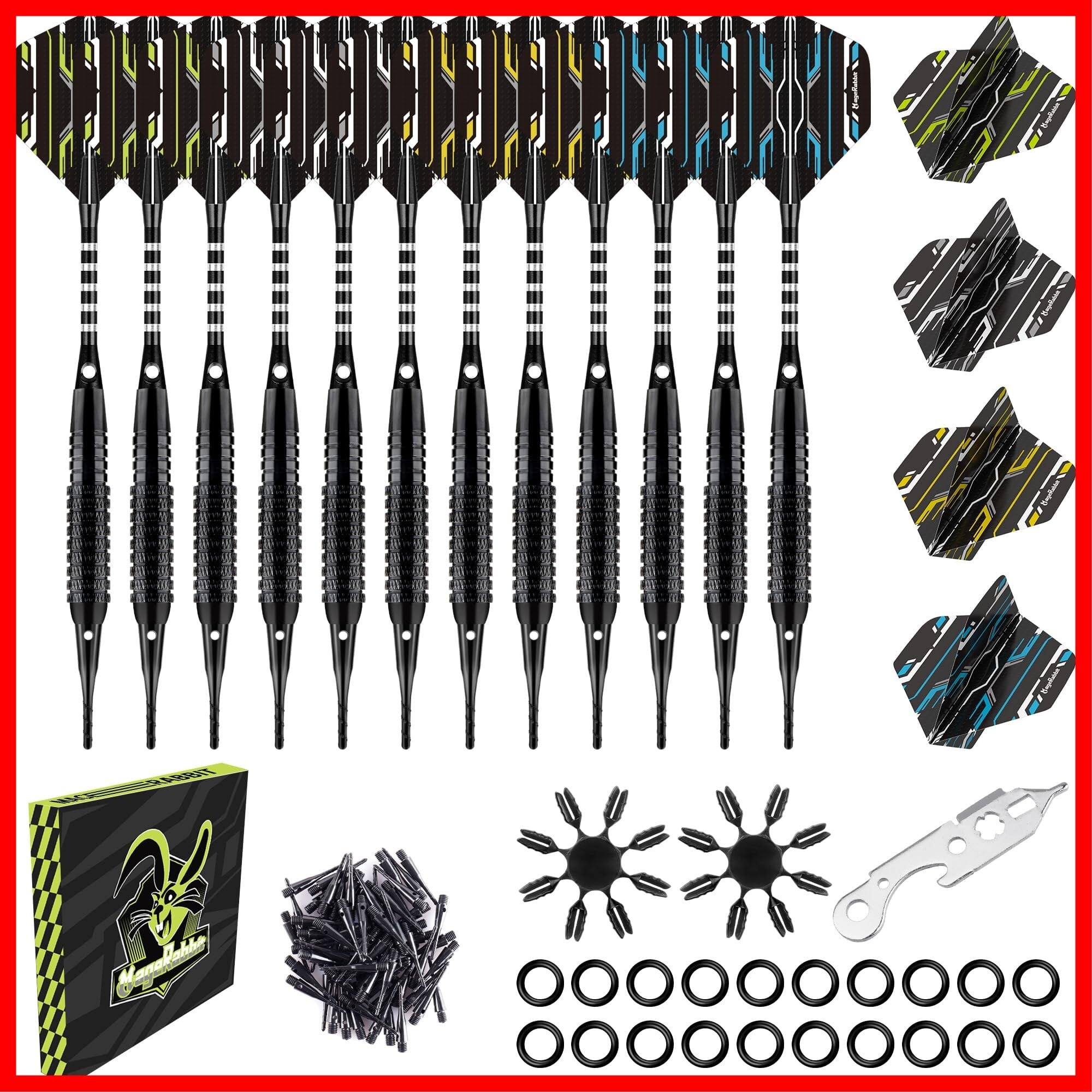 MageRabbit プラスチックチップダーツ 12本 18g, 16pcsのダーツフライト, 50個の予備のダーツチップ, 2個のフライトプロテクター 1個のレンチ付き,50pcs 2BAポイント・ティップ,ダーツ 矢