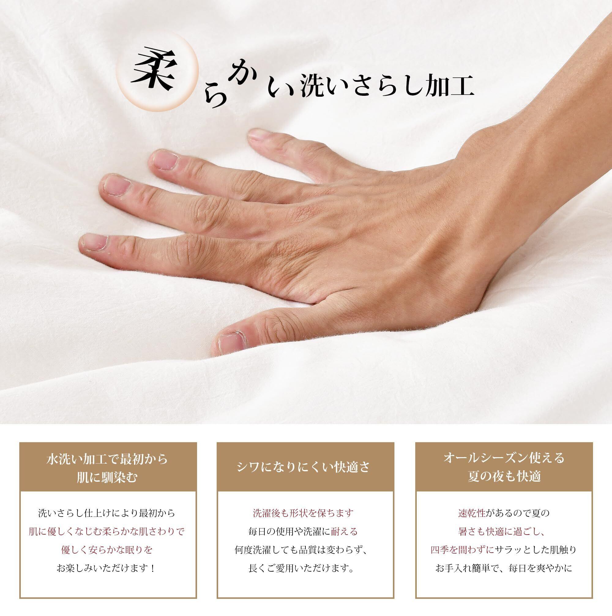 【オールシーズン使える】水洗い加工で普通のピチスキンカバーと比べ、優れた吸湿性と通気性で、汗でもベタつかないサラサラ感を保ちます。ムレにくく、春夏秋はサラサラ、冬は暖かくて季節を問わず、一年を通じて使用できます。丁寧に織り上げることにより、耐久性にも優れたしっかりとした生地に仕上がりました。