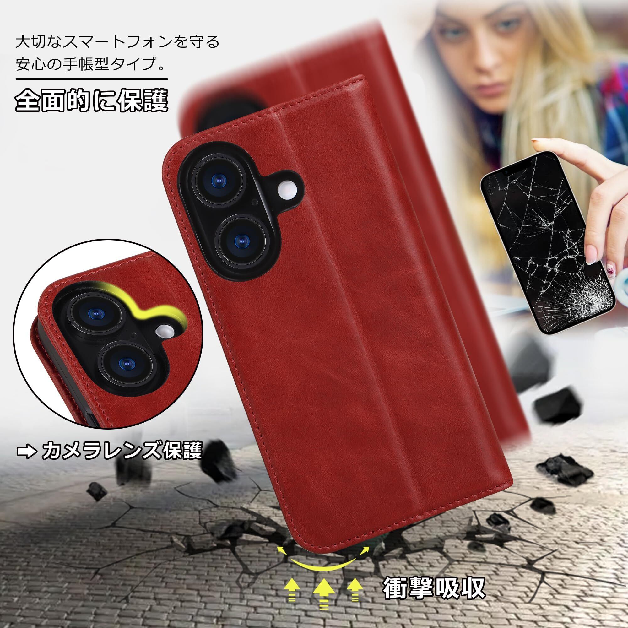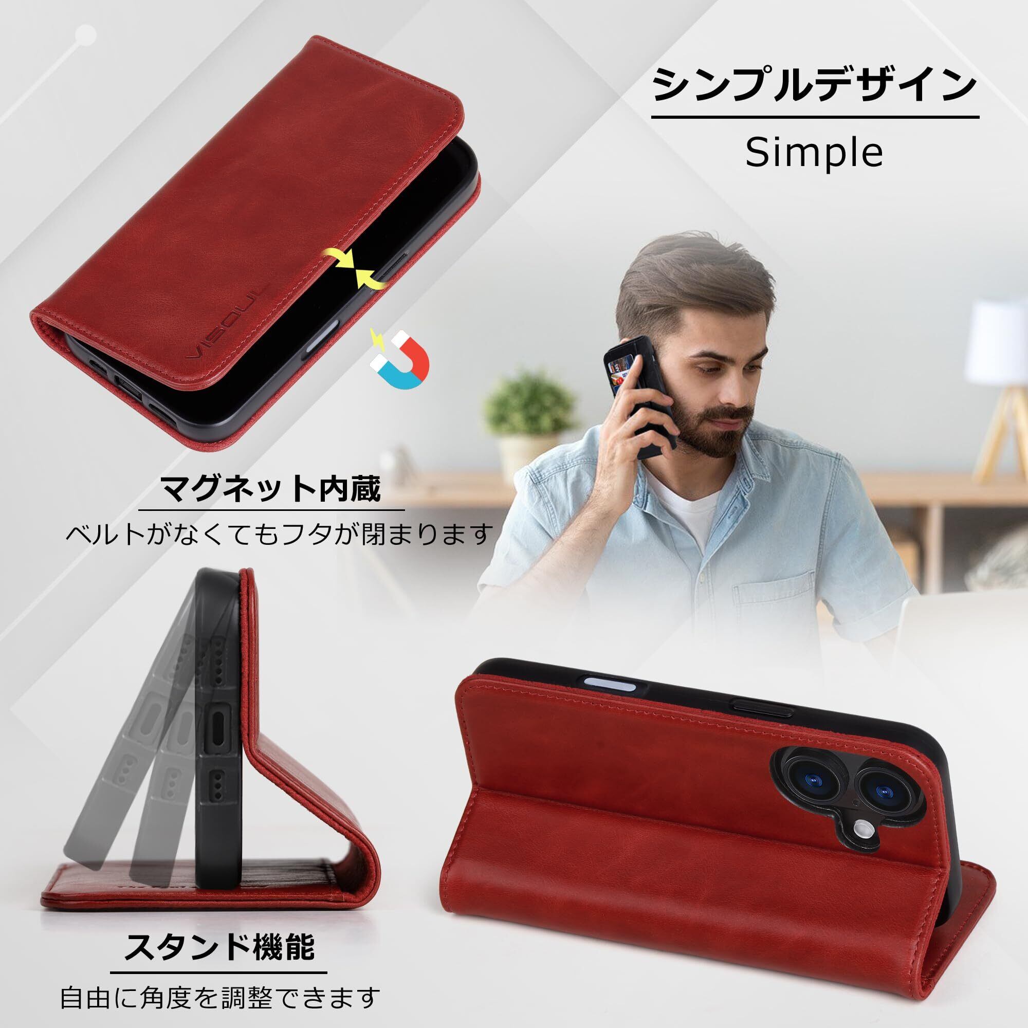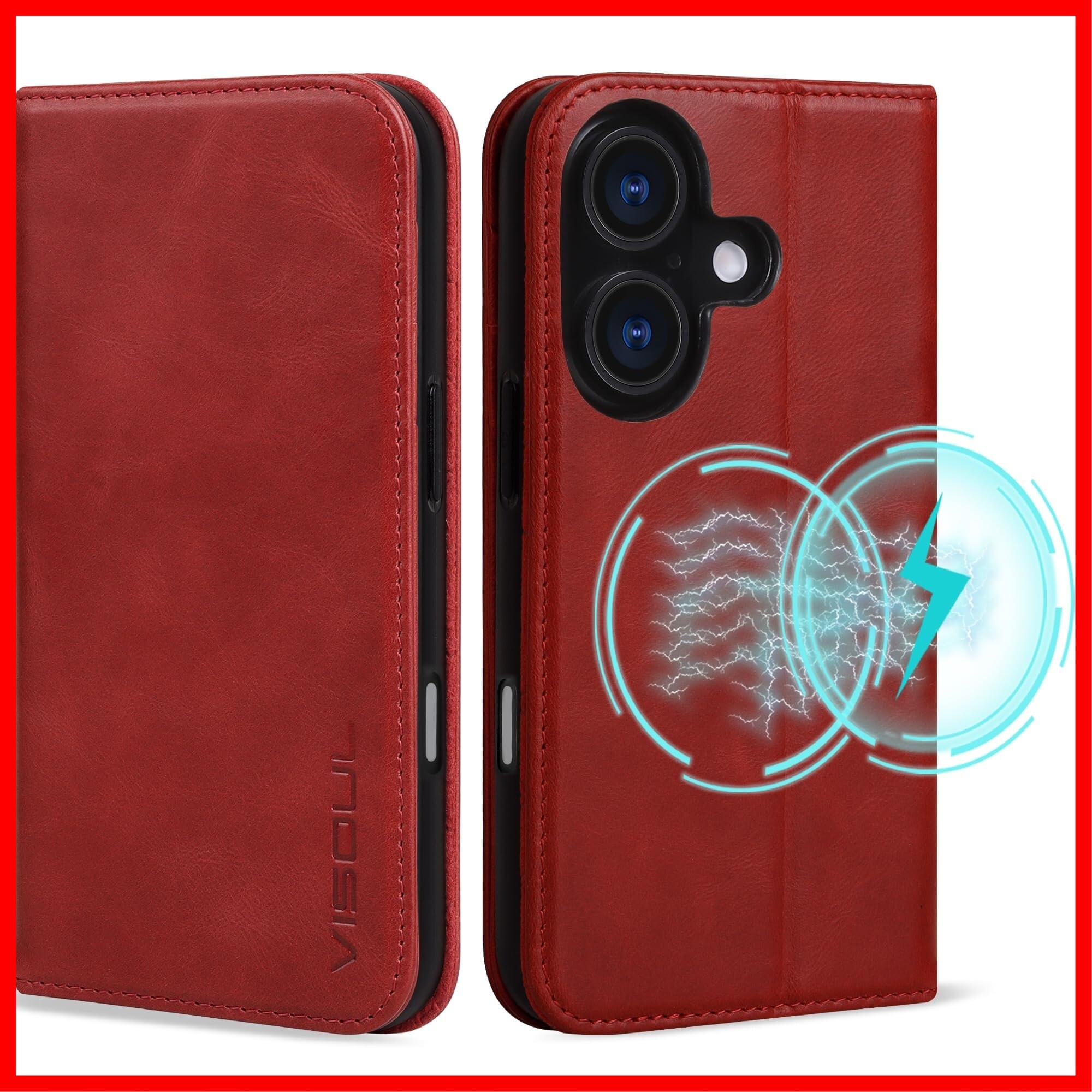 VISOUL iPhone16 対応ケース 手帳型 本革 手帳型ケース アイフォン16 ケースMagSafe対応 アイホン16 横置きスタンド機能付き手帳型ケース スマホケース ワイヤレス充電対応レザーケース カード収納 携帯ケース 全面保護 マグネット 柔軟なTPU素材 あいふぉん16ケース 6.1インチ対応 アイフォン16 レッド