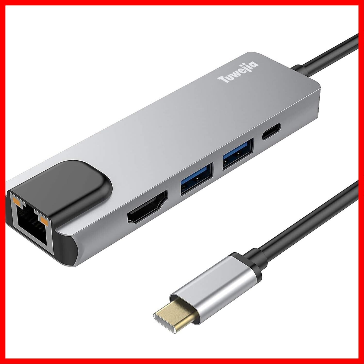 USB type C HDMI LAN ハブ タイプC 変換アダプタ 5in1 Tuwejia 4K解像度 HDMI出力+1Gbps イーサネット LANポート+USB-A データ転送ポート*2+高速PD充電ポートUSB-C LAN ハブ MacBook Pro/Air 13inch 2023/iPad Pro, Samsung Galaxy S11 などType-C デバイスに対応
