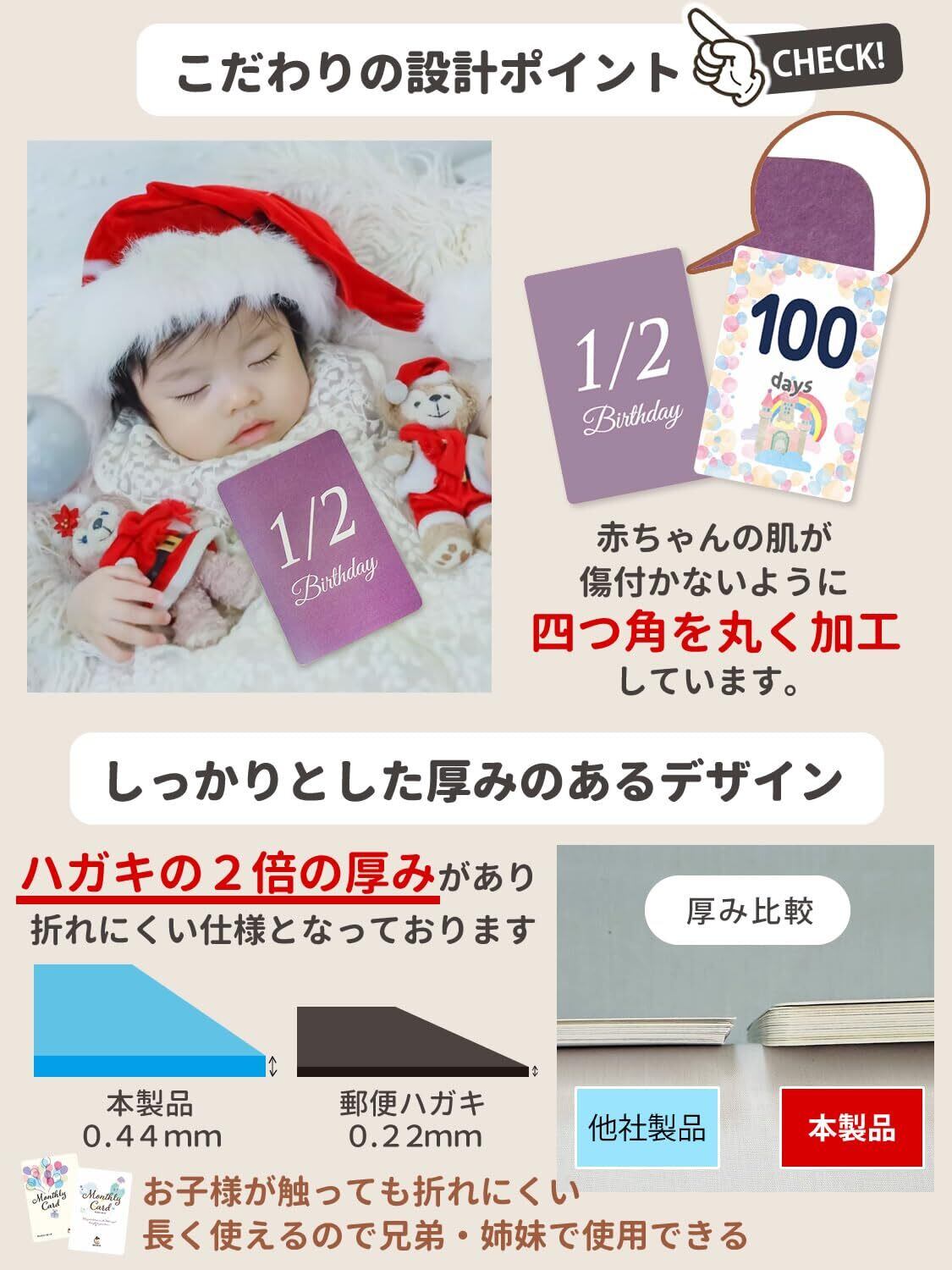 【長くお使いいただけるように厚みのあるデザインにしました】 「撮影時に、子供が触って途中で折れることがある」との声を参考に、 万が一お子様が触っても折れにくいように厚みのある紙を使用しております。 約ハガキの2枚分の厚みがあります。 丈夫な分、長く使えるので兄弟・姉妹で使用することが出来ます
