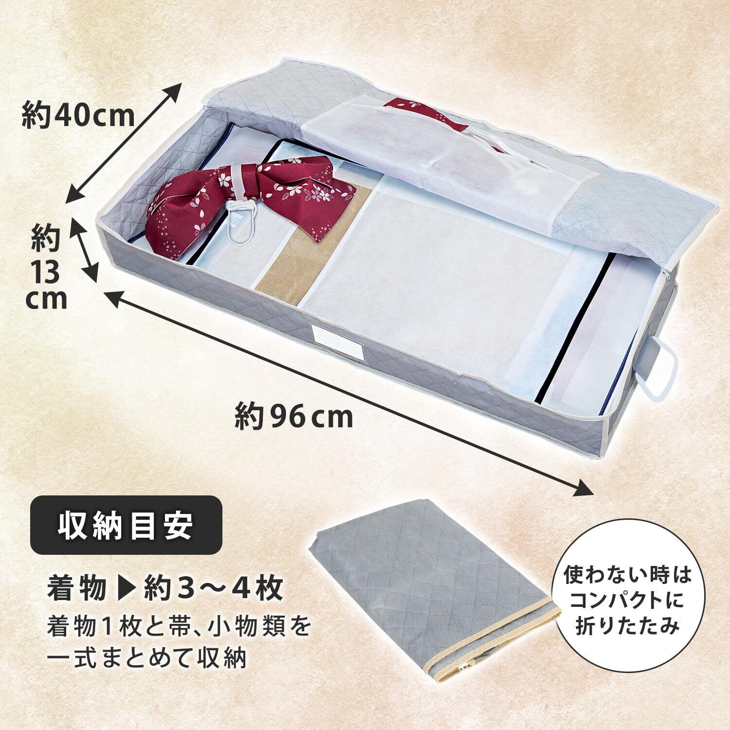 【商品仕様】:サイズ/約幅96×奥行40×高さ13cm、カラー/グレー、内容/1個、収納目安/たとう紙に入った着物(浴衣)なら約3~4枚・着物(浴衣)1枚と帯などの和装小物をまとめて収納も可能、材質/ポリプロピレン・ポリエステル