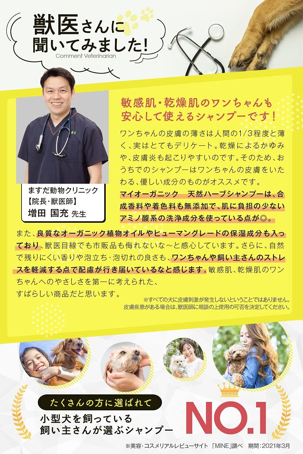 《舐めても安心!目にしみにくい!ワンちゃんへのやさしさにこだわりました》無添加・オーガニック植物オイル配合。敏感肌・乾燥肌どちらのワンちゃんにも安心してご使用いただけるシャンプー。 肌に負担の少ない弱酸性のアミノ酸シャンプー。植物由来成分97%で、ワンちゃんへのやさしさを第一に考えました。 ワンちゃんが嫌がる成分すべて不使用(シリコン、石油系洗浄剤、鉱物油、着色料、合成香料) ※現役獣医:ますだ動物クリニック 増田院長推奨シャンプー。