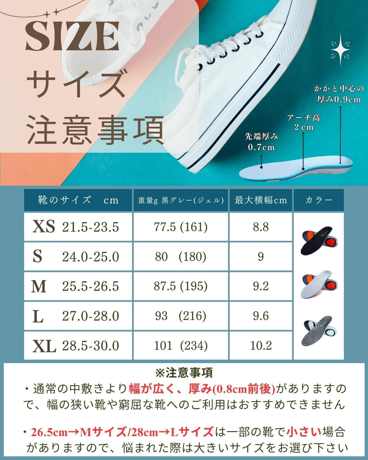 【サイズ選択について】 本商品は靴のサイズに合わせてご利用いただくインソールです。お客様の靴サイズに最も近いサイズをお選びください。ただし、靴の形状やデザインによりフィット感が異なる場合がございます。