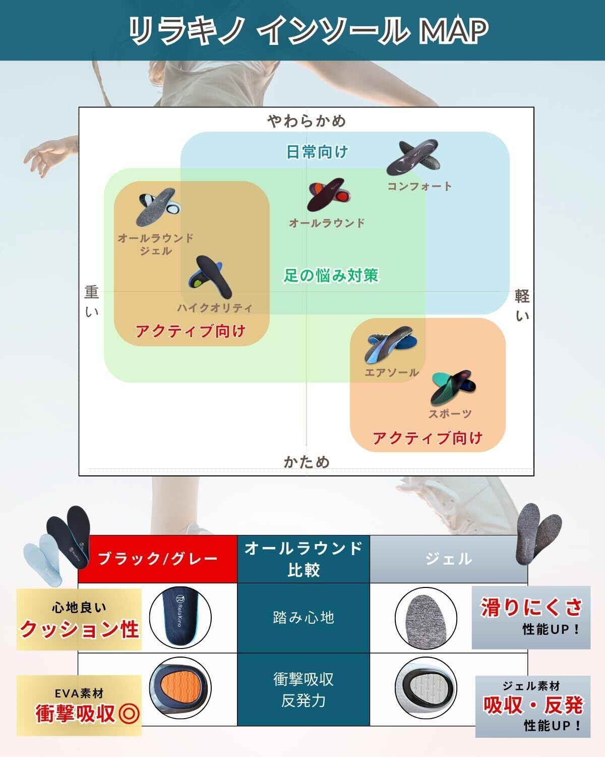 【十分な基本性能】 衝撃吸収、滑りにくい、グリップ性、消臭、軽量の基本性能を備えた中敷きになっています。男女兼用で運動以外に立ち仕事や日常使いでも活用できます。