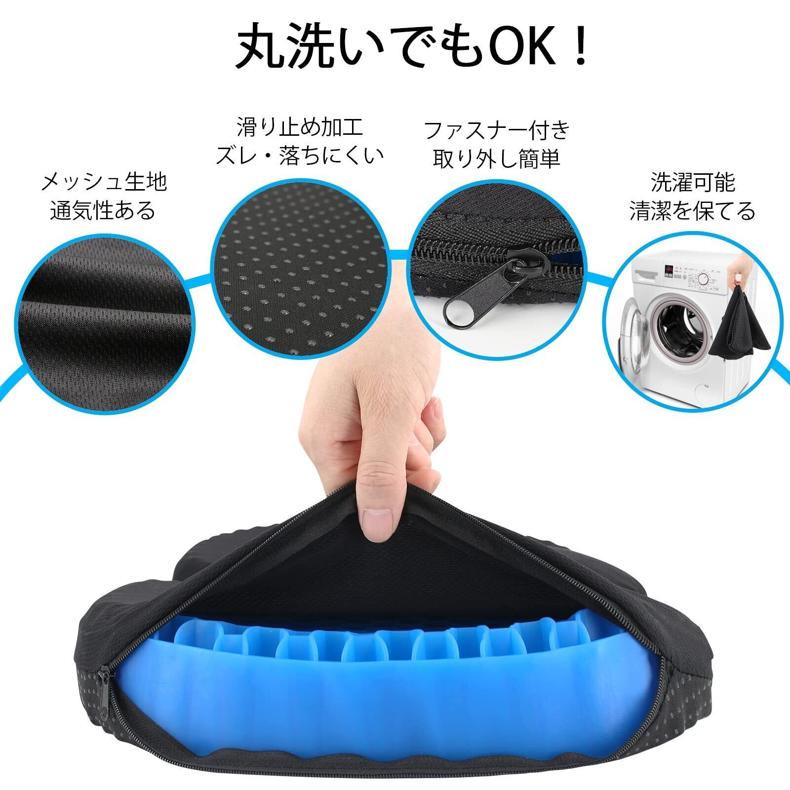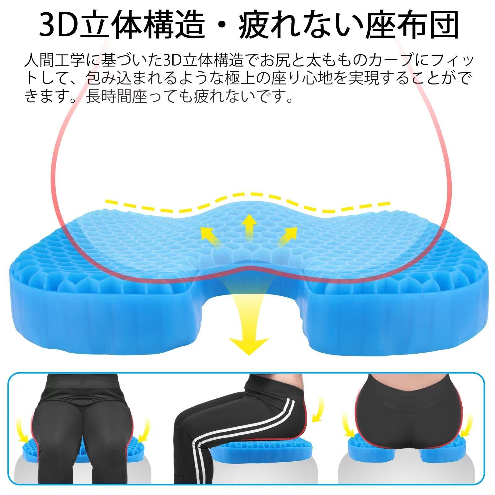 体圧分散・姿勢調整: U字形のゲルクッションで、長時間座っても体に負担がかからないように支えてくれます