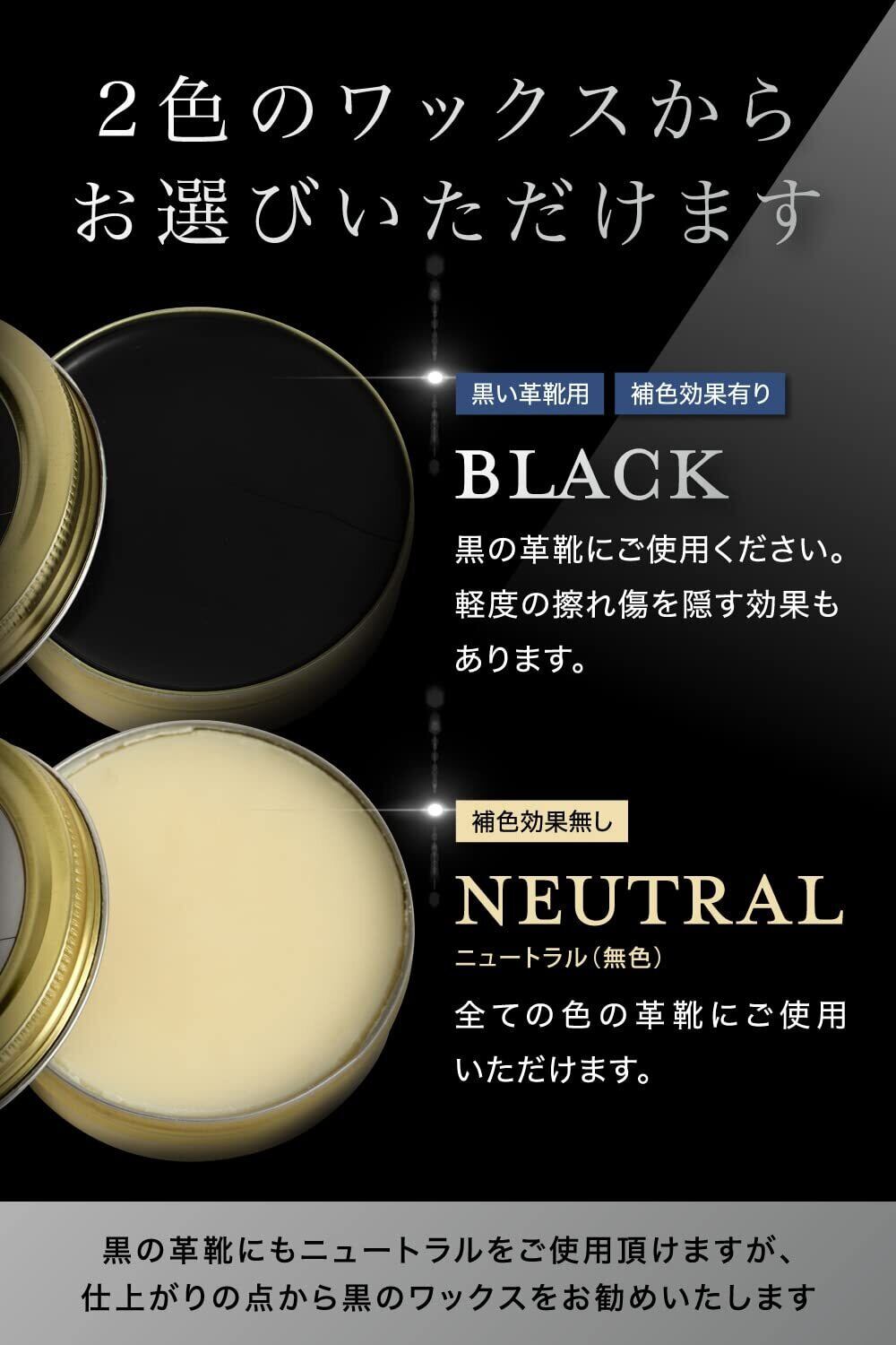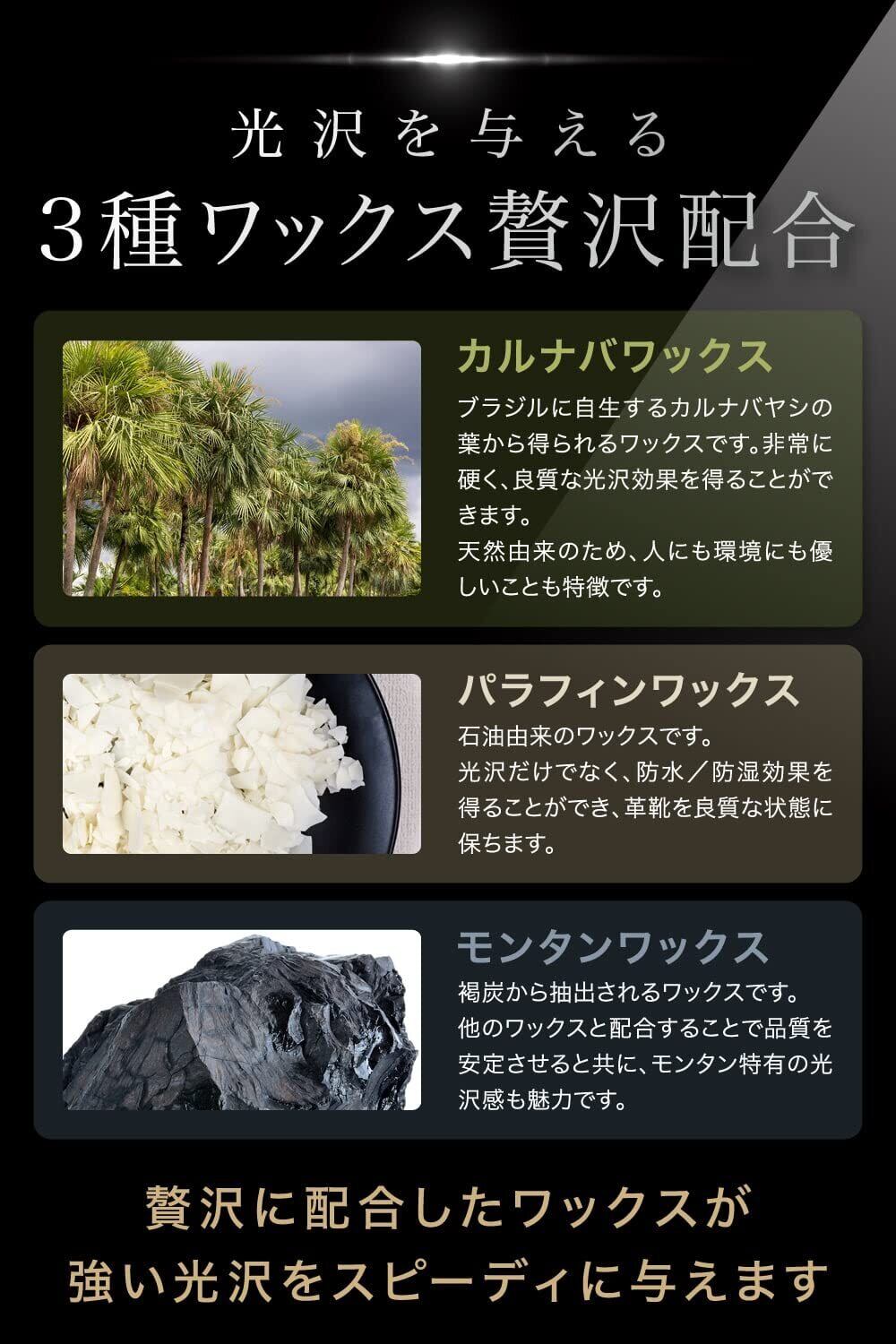 革靴の鏡面磨き用ワックスです。 靴磨きの最終工程としてお使いください。あなたの革靴を輝かせます。 初めての方向けにフルカラー説明書付きなので、これまで鏡面磨きが上手くいかなかった方にもおすすめです。 光沢を得られるだけでなく、水を弾き、衝撃から守ります。 本品は製造から充填まで全て日本製です。 ビギナーの方向けにフルカラーの説明書付きです。 簡単、スピーディーに光沢を得られるよう通常のワックスより硬めになっております。 3種類のワックス(カルナバ、パラフィン、モンタン)配合しており、強い光沢が得られます。 ワックスが革靴を水、衝撃から守り、あなたの大切な革靴を輝かせます。