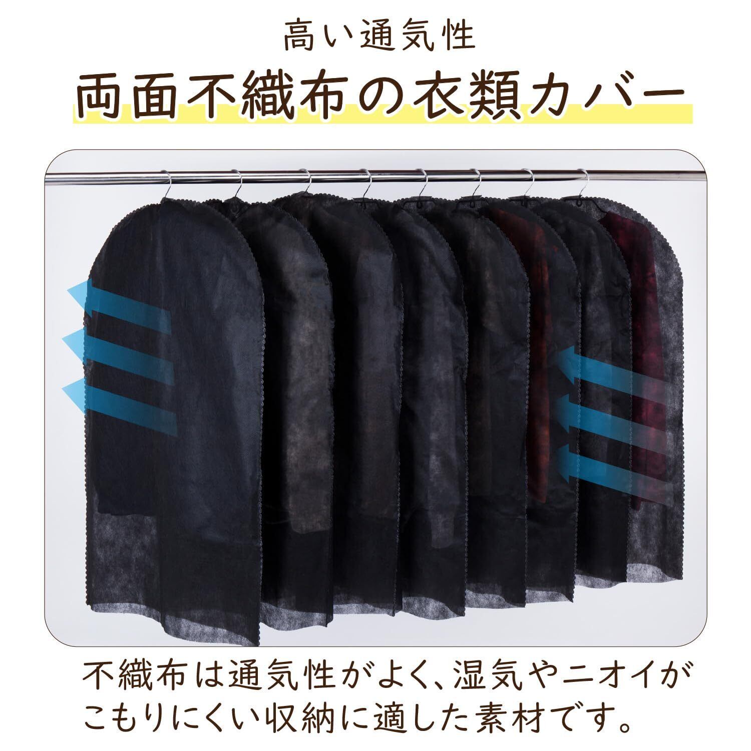 【通気性の良い不織布製ショートサイズ衣類カバー】:通気性が良く湿気やにおいのこもりにくい、ショートサイズの不織布製衣類カバー。