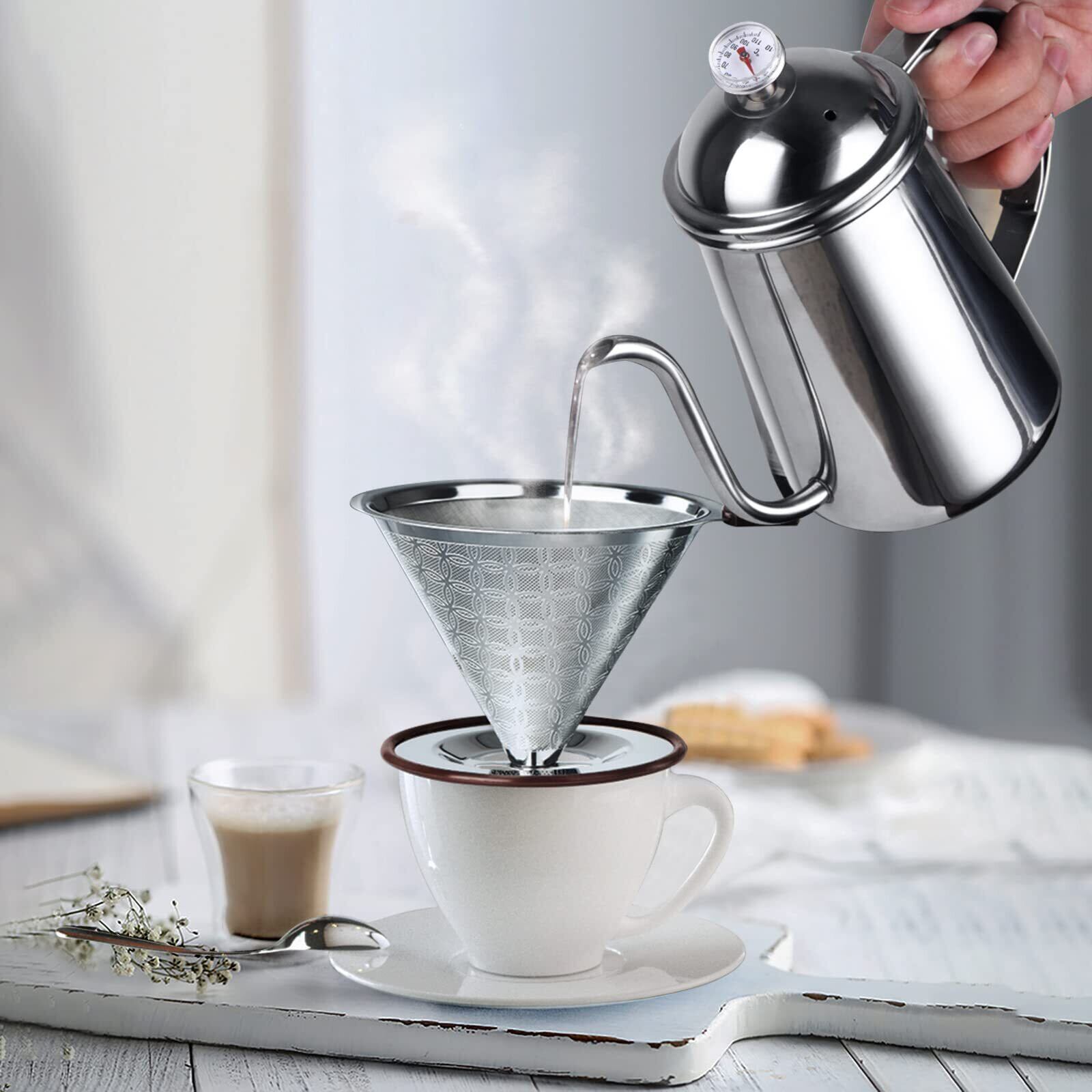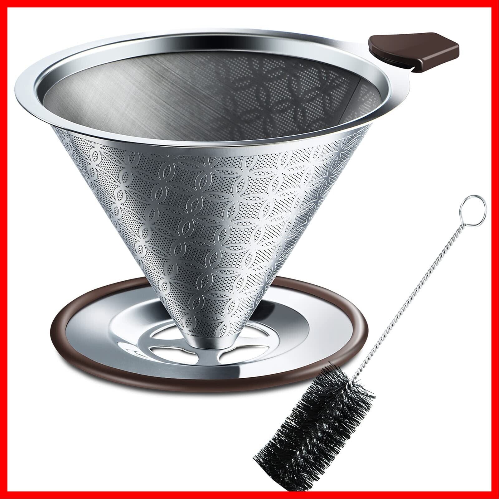 SRIWATANA コーヒードリッパー ステンレスフィルター 2層メッシュ 一体式 洗浄用ブラシ付き 4杯用