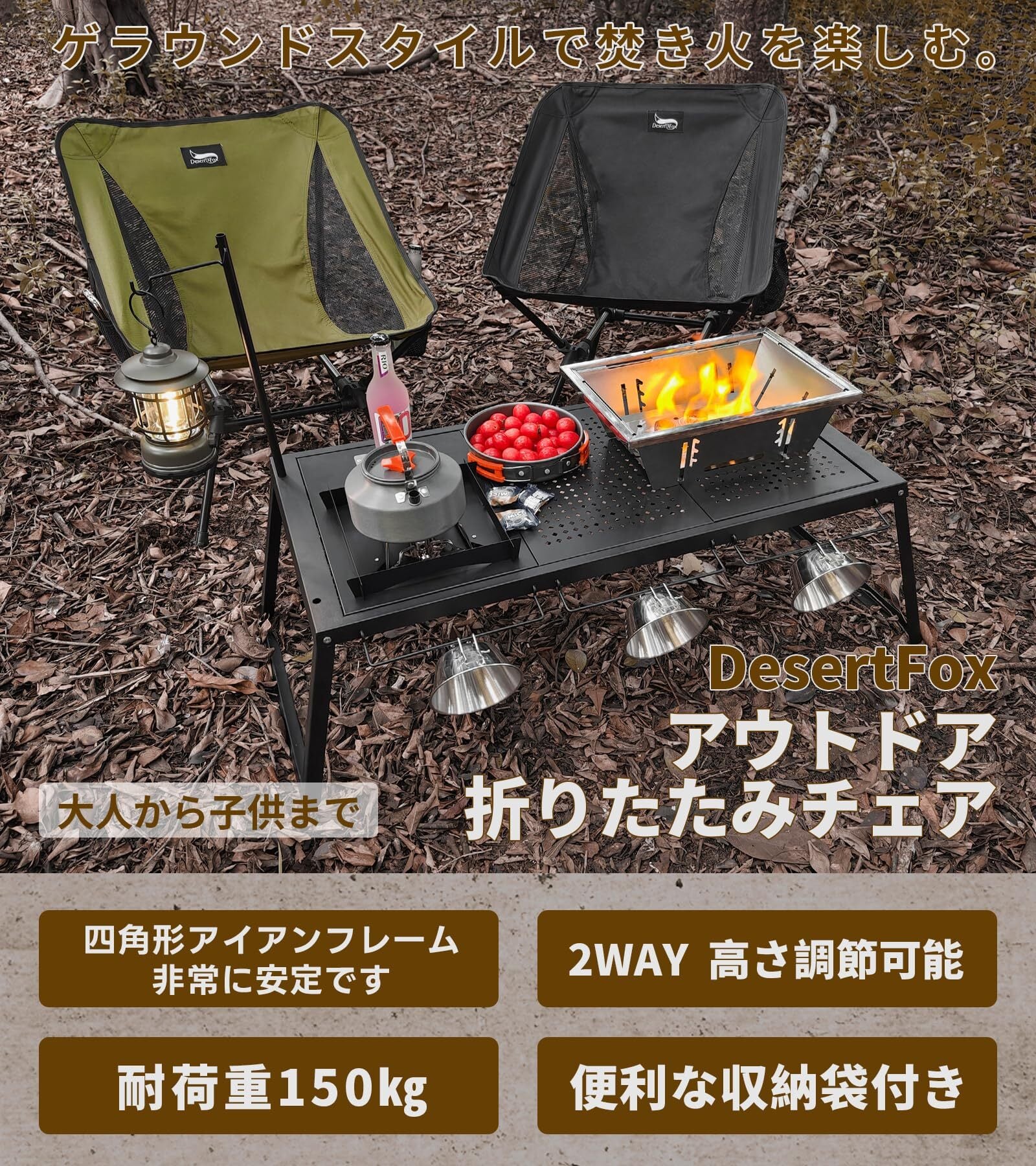 DesertFox キャンプ椅子 アウトドア チェア 2WAY 高さ調節可能 ローチェア 軽量 【独自開発のカップホルダー】 耐荷重150kg コンパクト イス ロータイプ 収納袋付属 携帯便利 ST