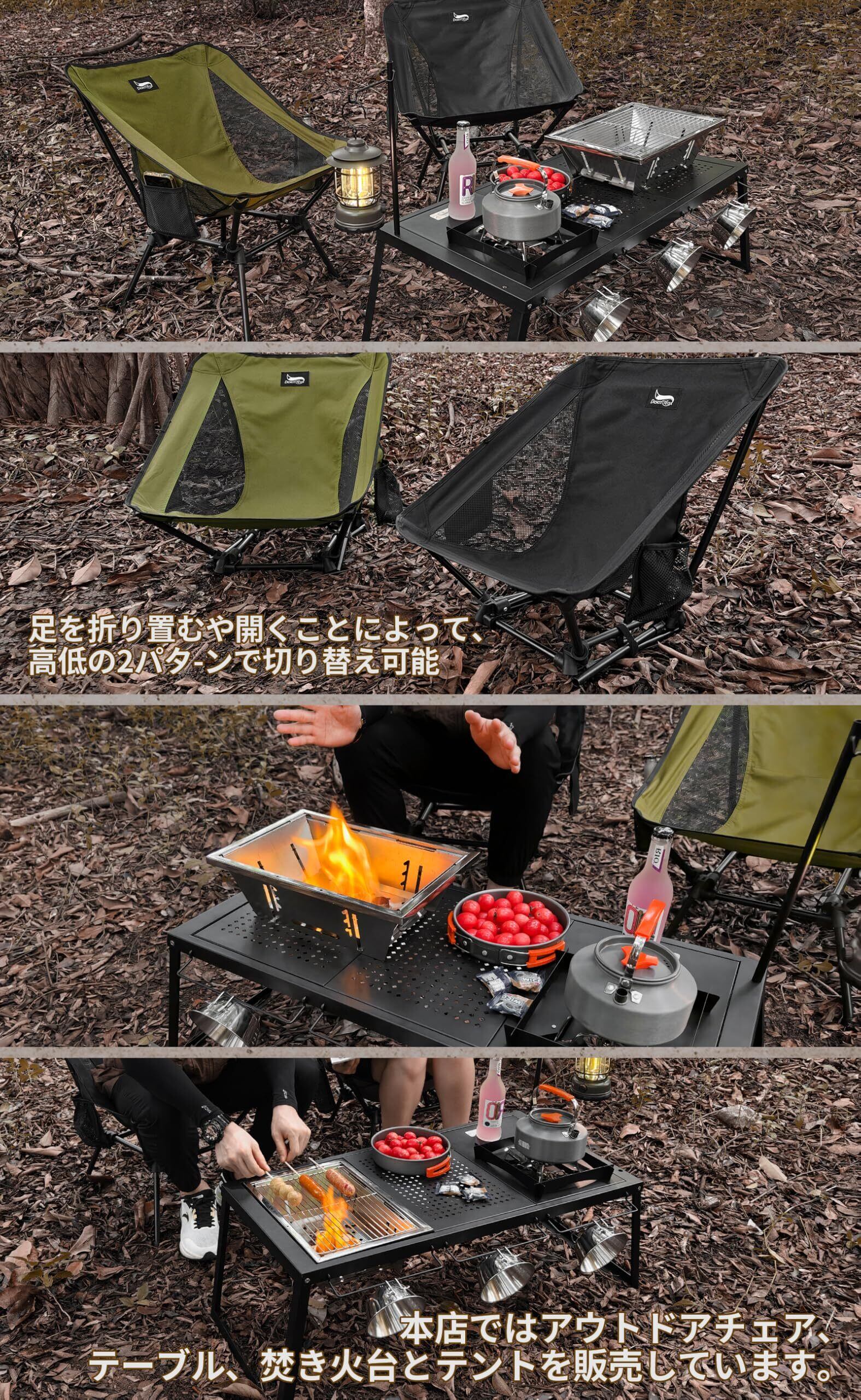 【高さ両パターンで切り替え可能】足を折り畳むや開くことによって、グランドとノーマルスタイルの両パターンで切り替え可能。焚き火に近づき暖まることや、足を伸ばすことができ、より多くのシーンで大活躍!【四角形フレームでより安定】伝統的なキャンプ椅子と違い、座面の下のフレームは四角形となっていて、全体的に安定性がアップグレード!