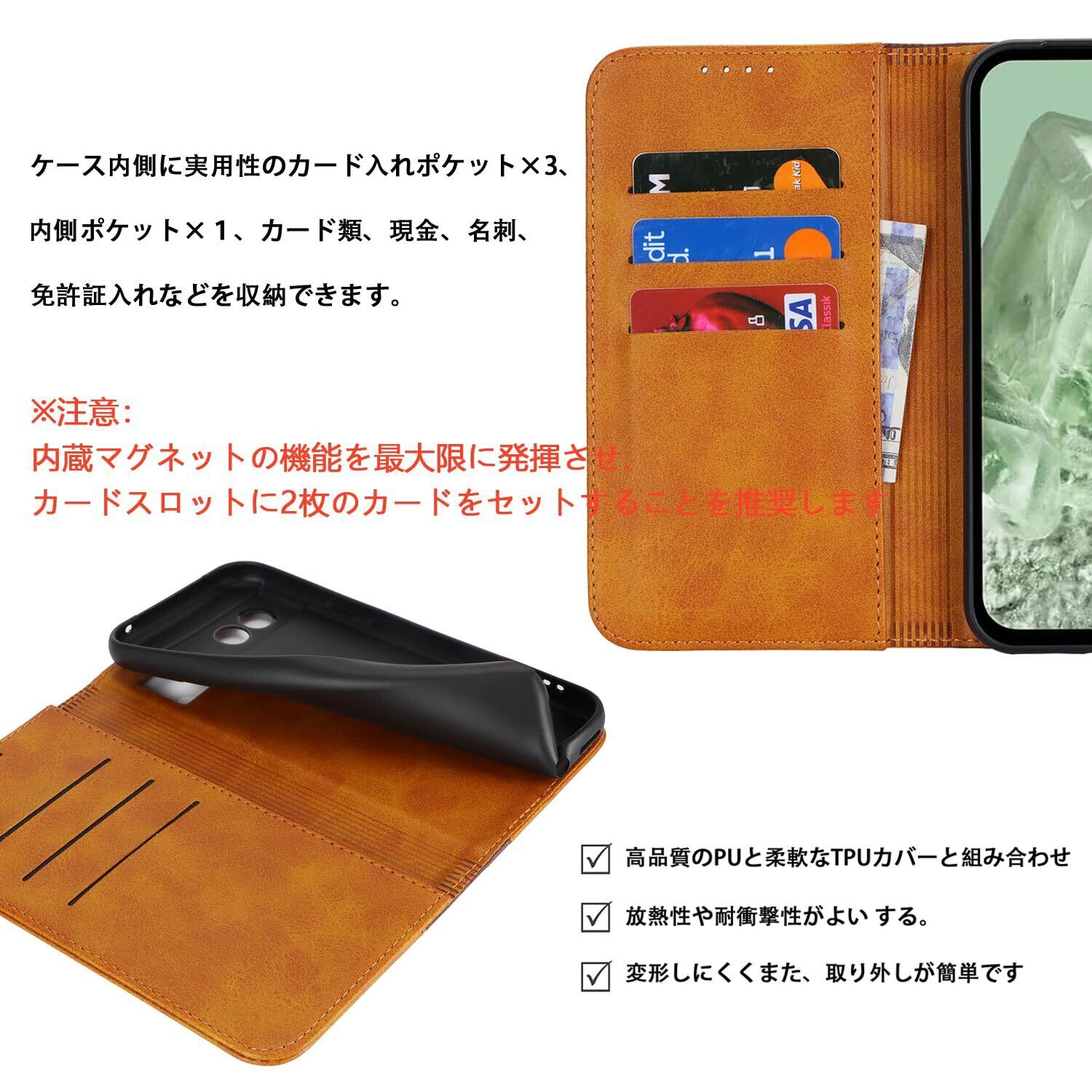 【収納機能】Google Pixel 8aケース内側には三つのカード入れとフリーポケットがつき、カード類や紙幣、名刺などが収納できます。カードスロットに2枚のカードを入れると、内蔵マグネットの機能を最大限に発揮し、カードが消磁されるのを防ぐことができます。横置きスタンド機能が付き、横向いて斜めに立てて、自由に角度を調整して、お好みの角度で動画鑑賞や読書などを楽しめます。長時間での新幹線、飛行機の中での暇つぶしに最適です。