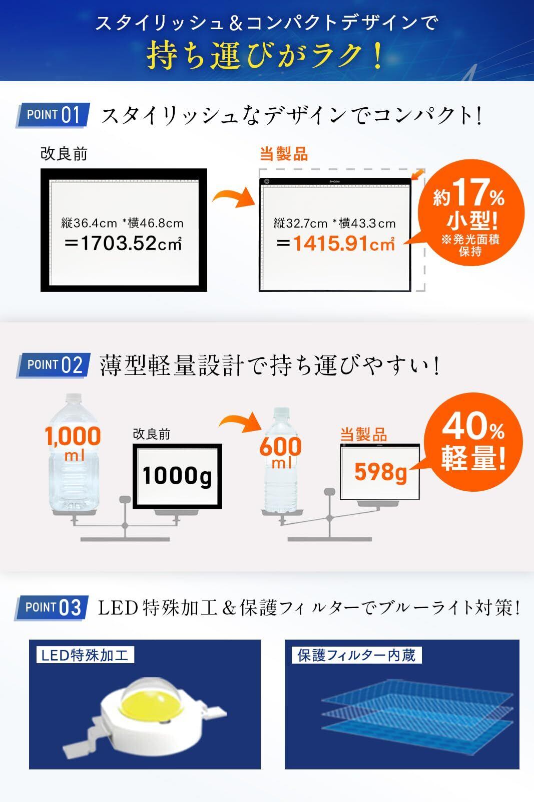 【軽量コンパクト設計】 従来の発光面サイズは保持し、限界まで 軽量 コンパクト 化を行いました。厚さ 4mm 重さは 598g 程度です。プロのイラストレータ様に推薦いただいており、自信を持って商品をお届けします■パネルは高品質なものを採用し明るくみやすいので スクリーントーン トレース作業 イラスト作成 製図 写し絵 に最適です