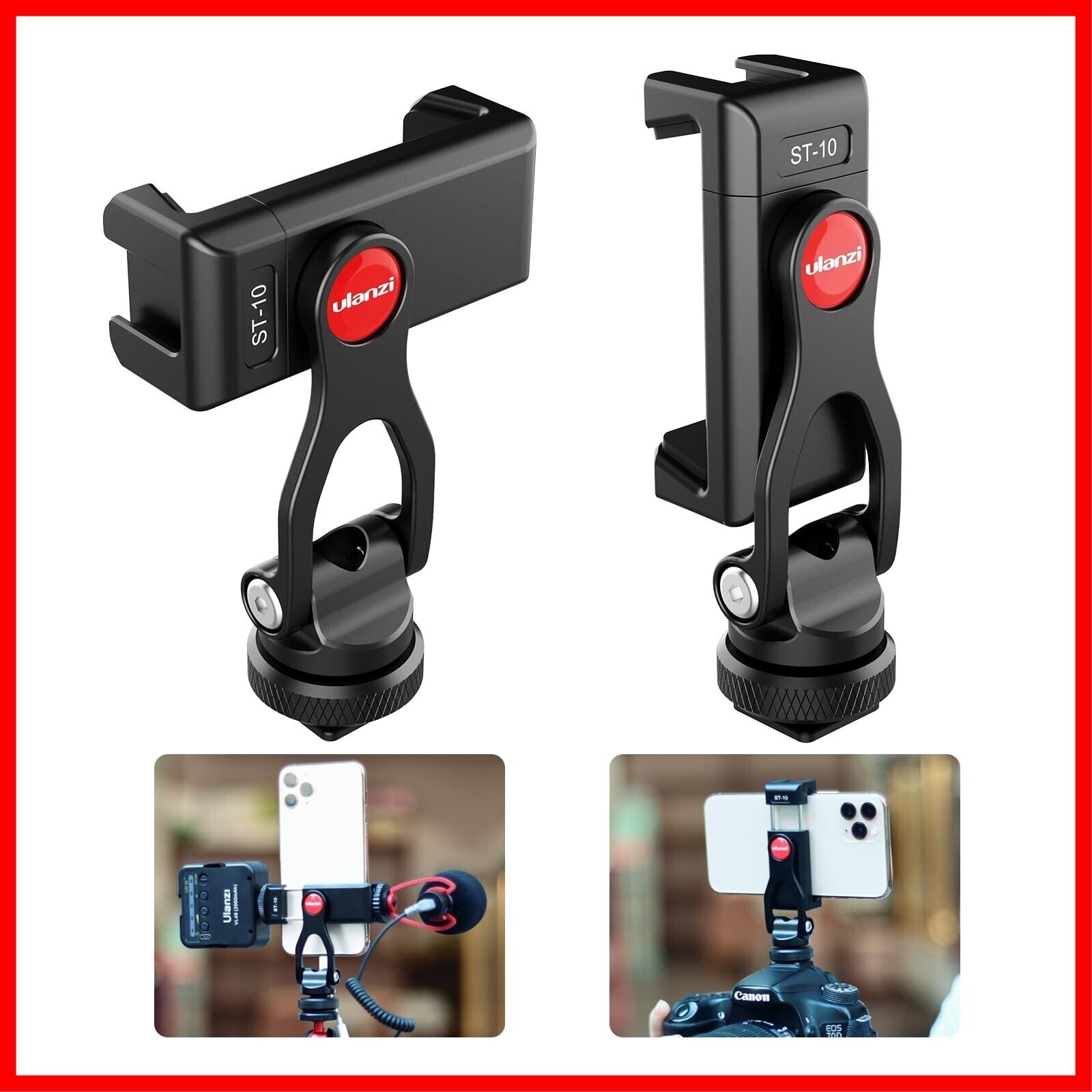 2つの接続方法--- ST-10スマホホルダーには、1 / 4穴により、すべての三脚および他のタイプの機器カメラ、自撮り棒に対応できます。それだけでなく、下の位置にはホットシューロックがあり、カメラにホットで固定できます。