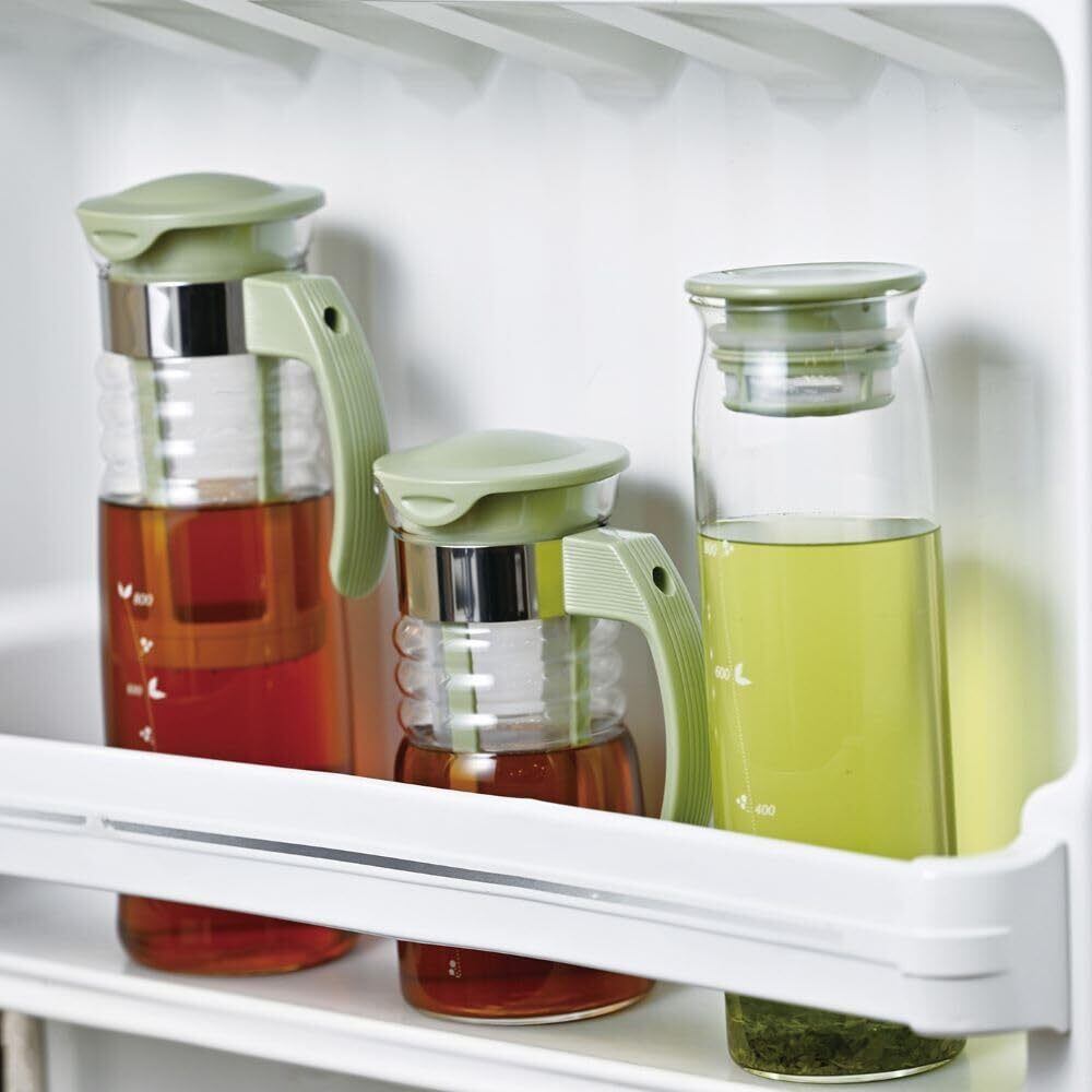 かご網茶こしの付いた水出し茶ポットかご網の茶こしに茶葉を入れ、水を入れます。フタをして冷蔵庫に入れ、3〜6時間置いてできあがり。お茶を抽出したら、かご網茶こしを取り外して保存ができます。