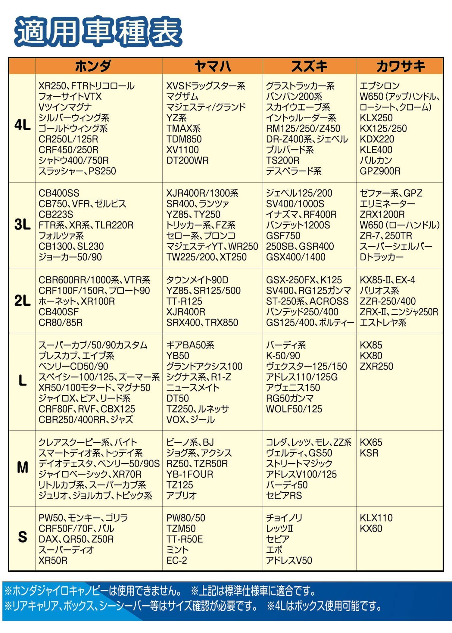 記載されていないバイクモータに付いはコンテンツのサイズ表をご参照になりすまして、ご愛車がどのサイズのカバーに適しているかを判断してください。