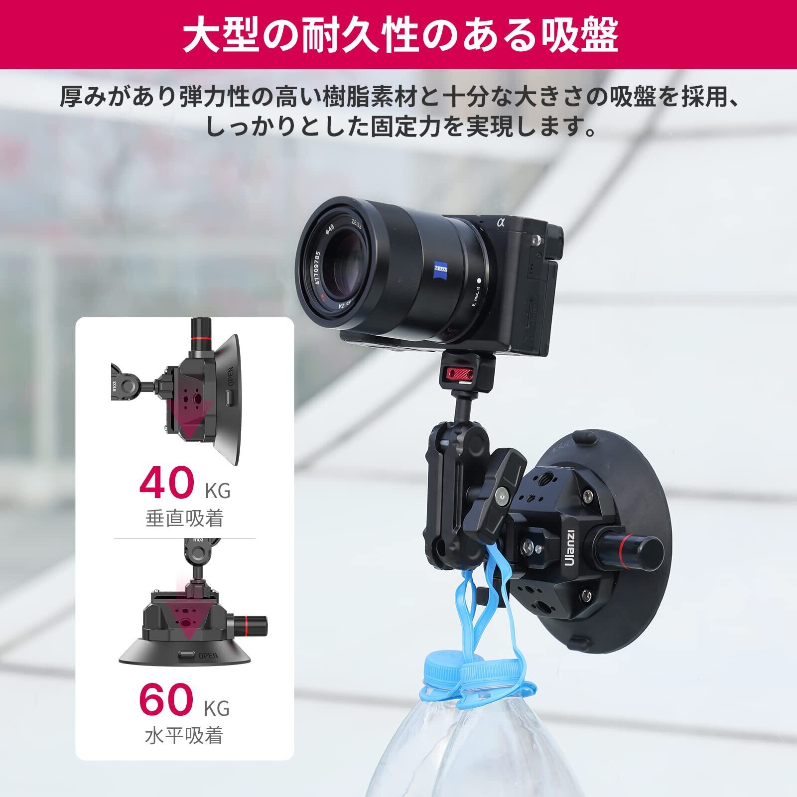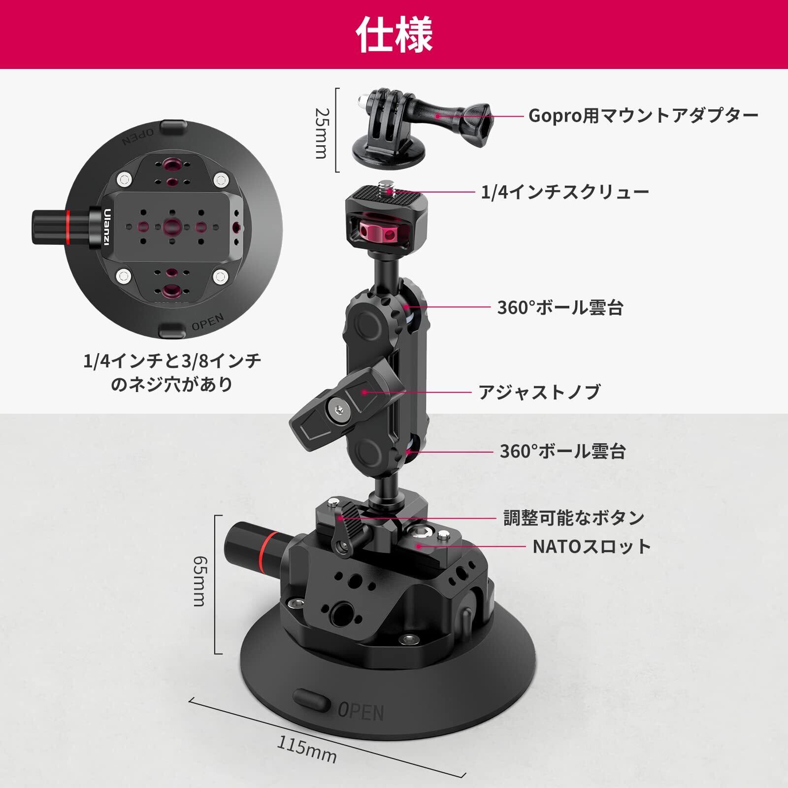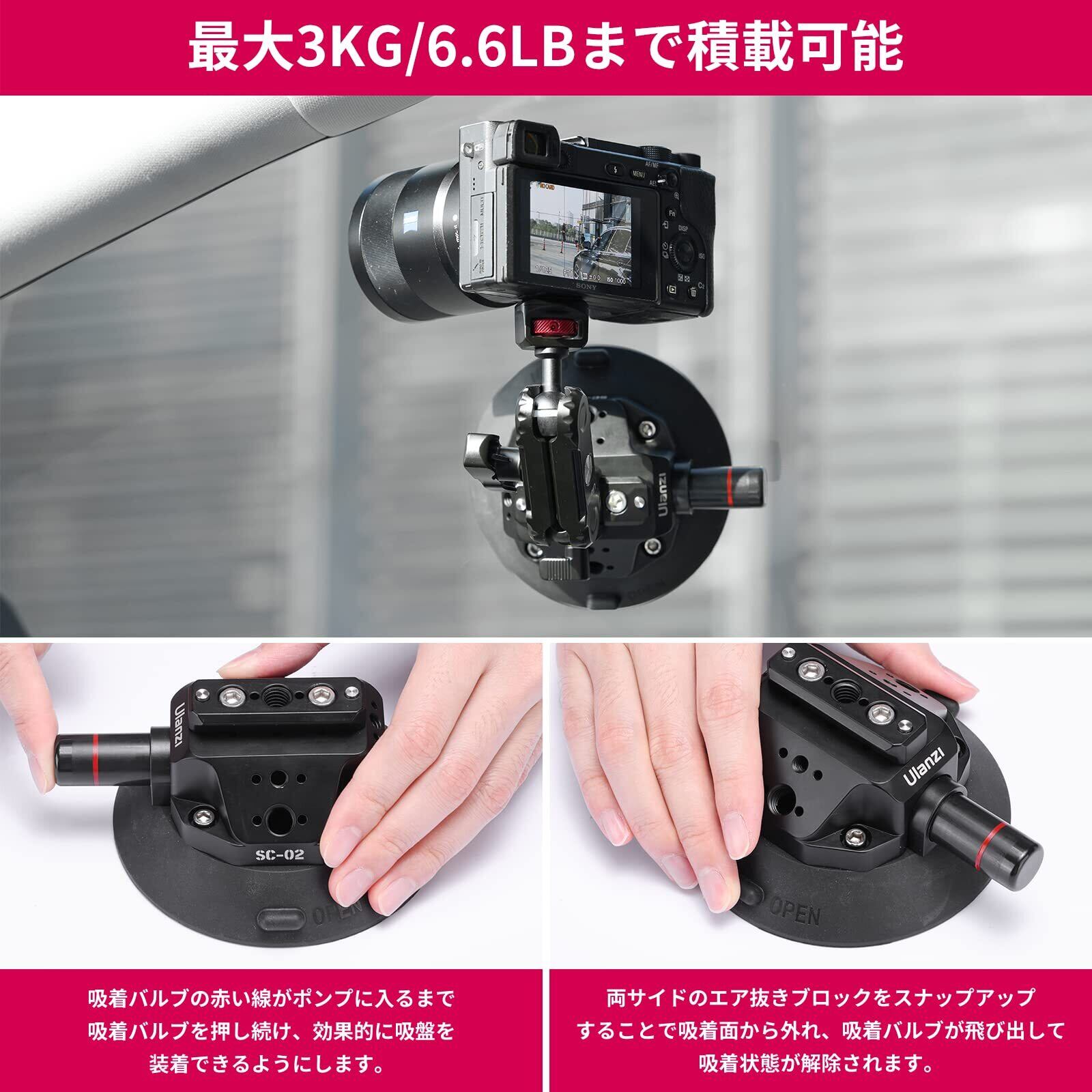 【幅広い互換性&様々なシーンに】】複数の1/4''、3/8''ネジとアダプターを装備し、ボールヘッドとマジックアームの接続が可能で、拡張性が高いです。サクションカップは取り付ける面がゴムの吸盤になっており、平でツルツルした場所に付けて使用できます。取り付け方法が簡単で真空ポンプを ポンピングする事でバキュームカップが吸着し車体とピッタリ!一般的車の場合は、フロント・リア・サイドのガラスに吸着します。サーキットカーなら、車外フロント部分・ルーフ(屋根)部分・サイドドア、バイクならヘルメットにも取り付けができます。