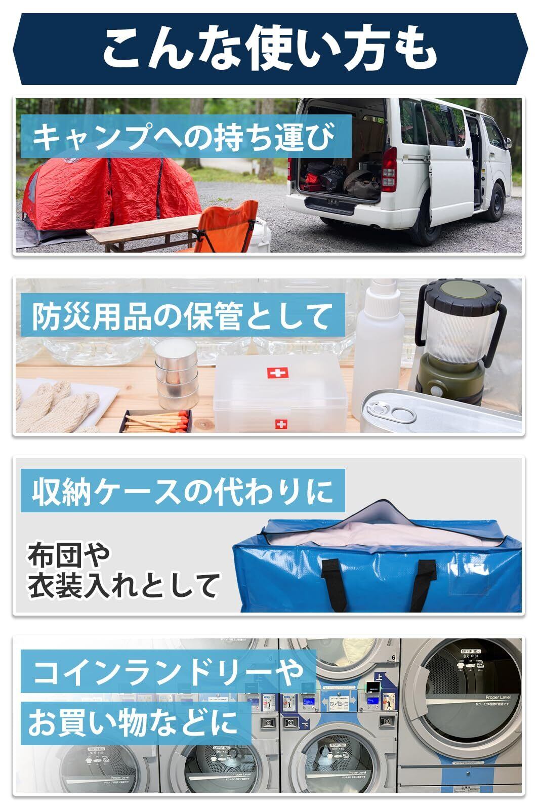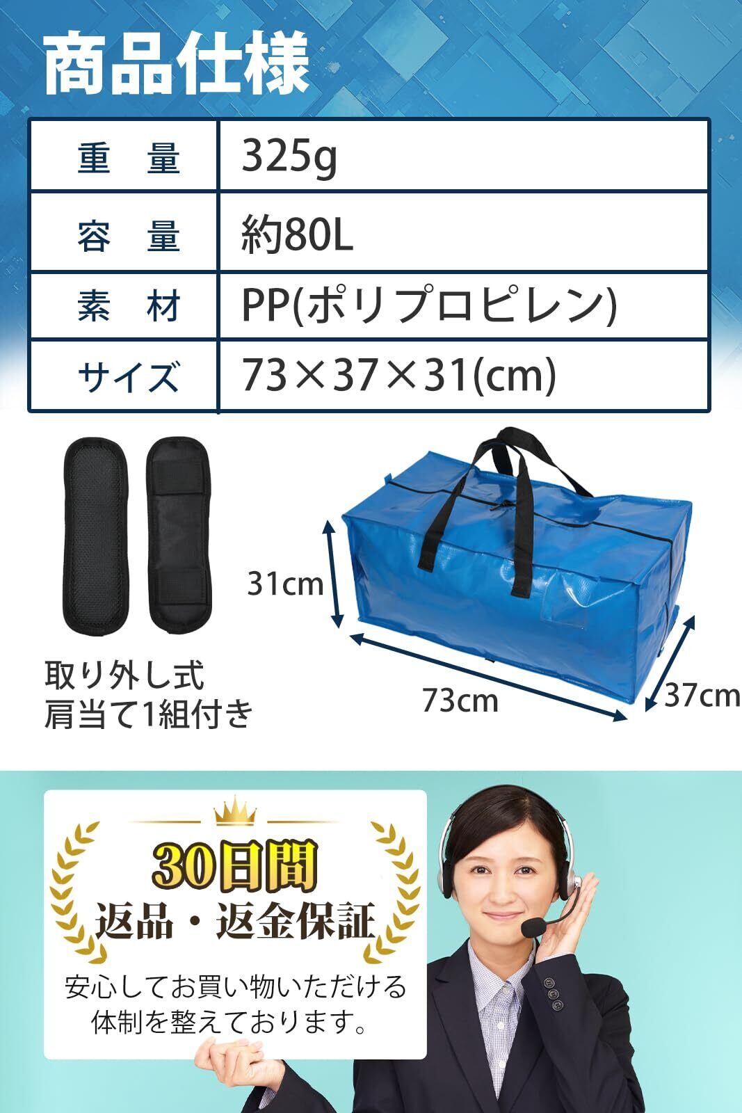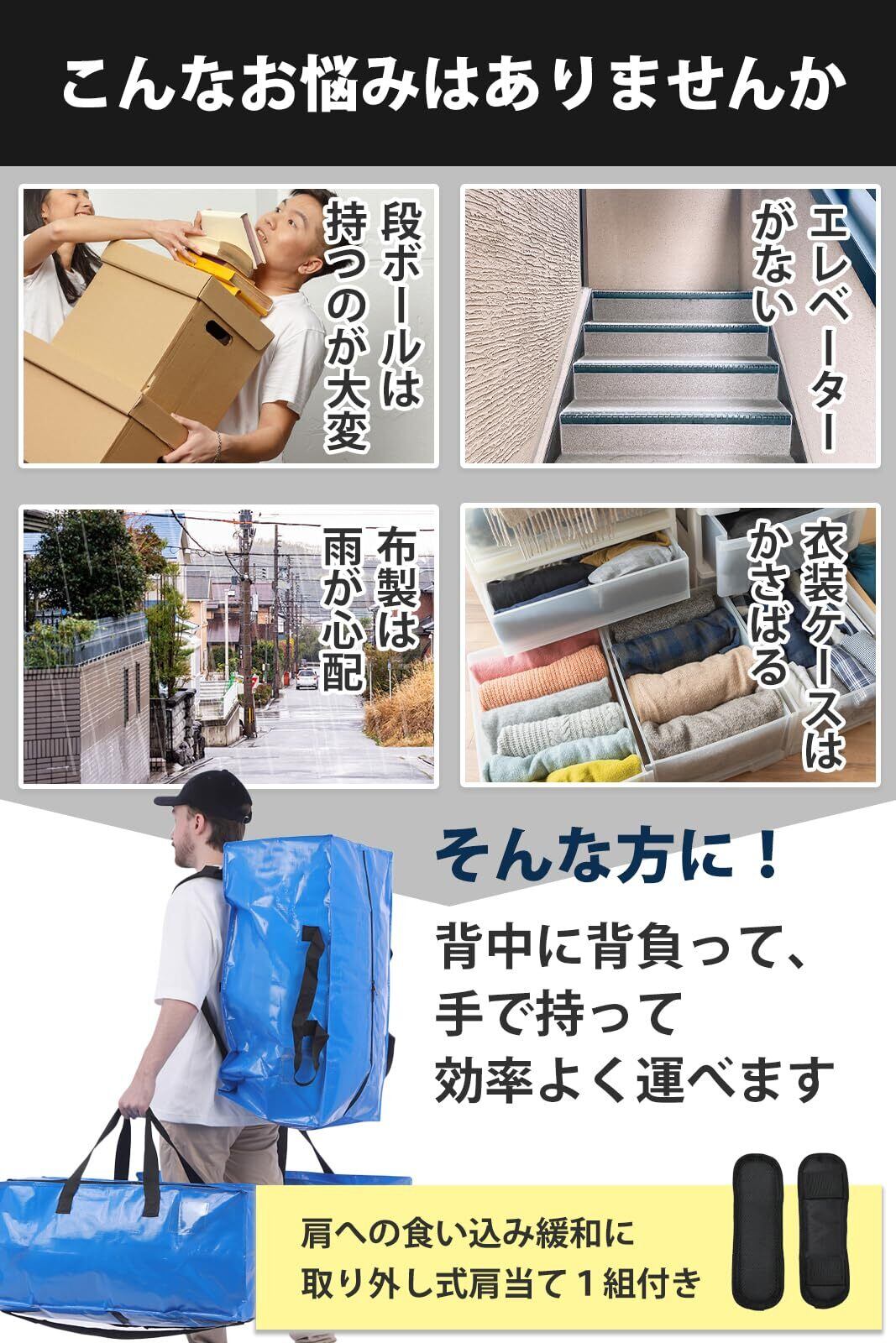 【引っ越し・大荷物の移動に】軽くて大容量だから、様々な用途で活躍。イベント・催事・スポーツ・コインランドリー・防災袋・キャンプ・アウトドア・マイバッグなど。●サイズ:縦73×横37×高さ31cm●素材:PP(ポリプロピレン)●内容:収納袋/肩当て(1組2個)●色:青(2個/4個)・透明(2個/4個)
