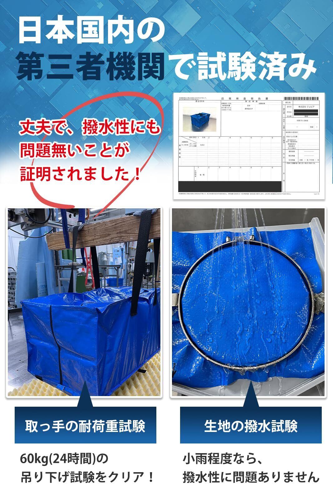 【軽くて丈夫。水にも強い!】バッグは重さわずか325g。小さく折りたためます。耐久性の高い持ち手は耐荷重試験60kg・24時間をクリア。重い荷物をしっかり運べます。さらに撥水性能もあり、小雨ほどなら濡れても大丈夫。催事や屋外活動でも使えます。