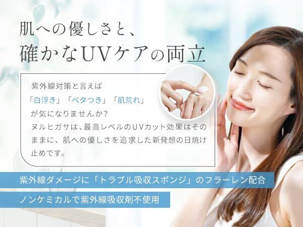 【ご使用方法】スキンケアで肌を保湿し、ヌルヒガサを適量手に取り顔になじませます。顔だけではなく体にもお使いいただけます。汗をかいたときなどは、2~3時間ごとに軽く重ねて塗り直しをしましょう。