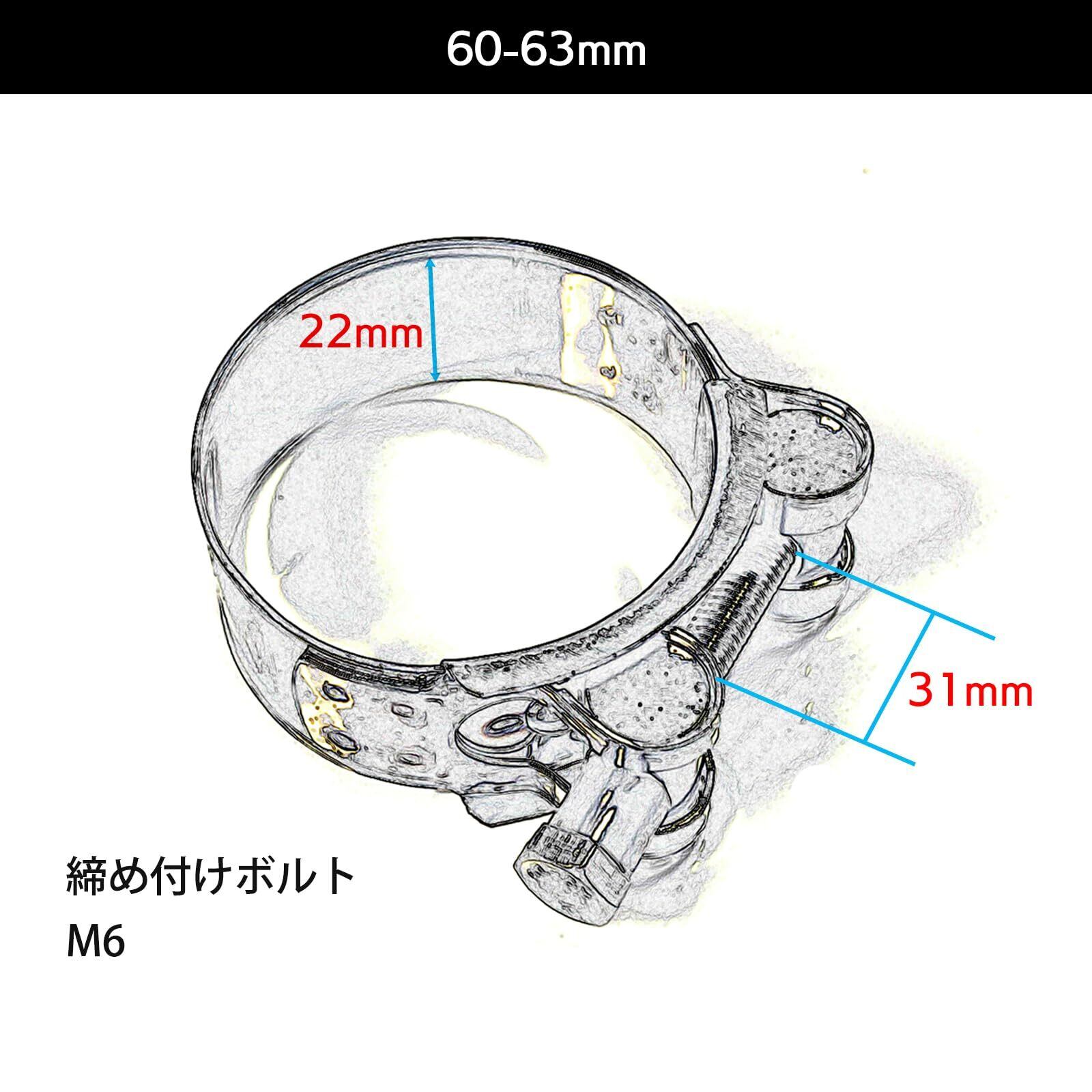 汎用品として販売されており、48-51mm、52-55mm、60-63mmのサイズ展開があり、さまざまなマフラー径に適応します。バンド幅は22mm、締め付けボルトはM6規格で長さ60mm。取り付け時の調整余裕も約3mm確保されているため、スムーズな設置が可能です。ボルトを締めることで簡単に固定でき、初心者の方でも手軽に取り付けられます。