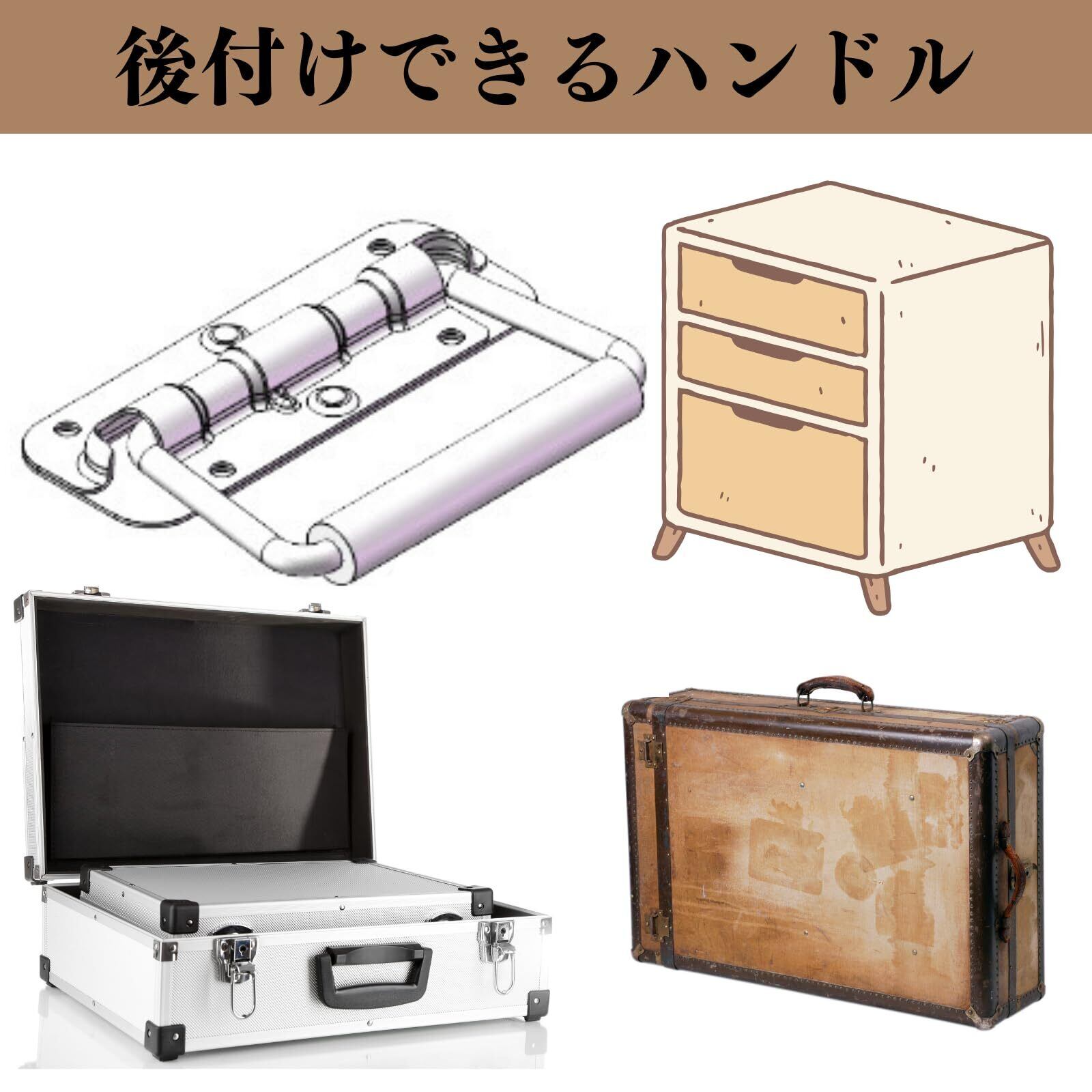 トランクやコンテナ、キャビネットなどに後付けできるハンドルです。取っ手のない箱にこのハンドルを取り付ければ、持ち運びを楽にし、作業効率を向上させます。