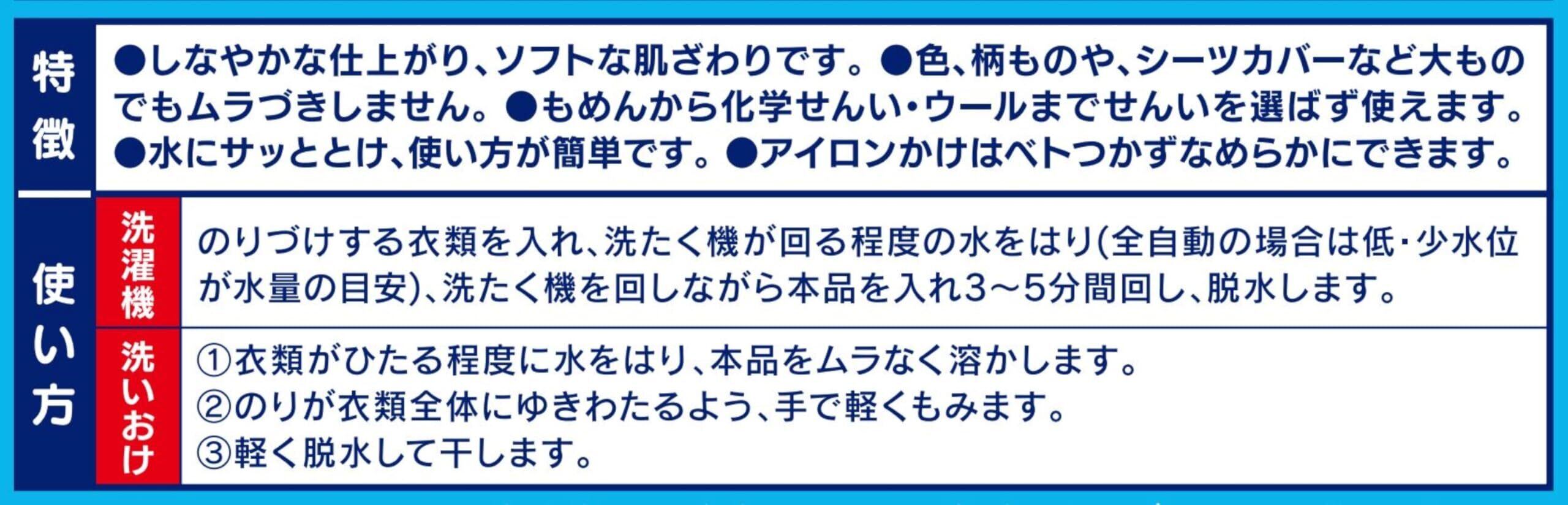 洗濯機で使える洗濯のり。他の液体、ゲル状、粉末タイプの洗濯のりと違い洗濯機で使用できる為、糊付けが簡単にできます。