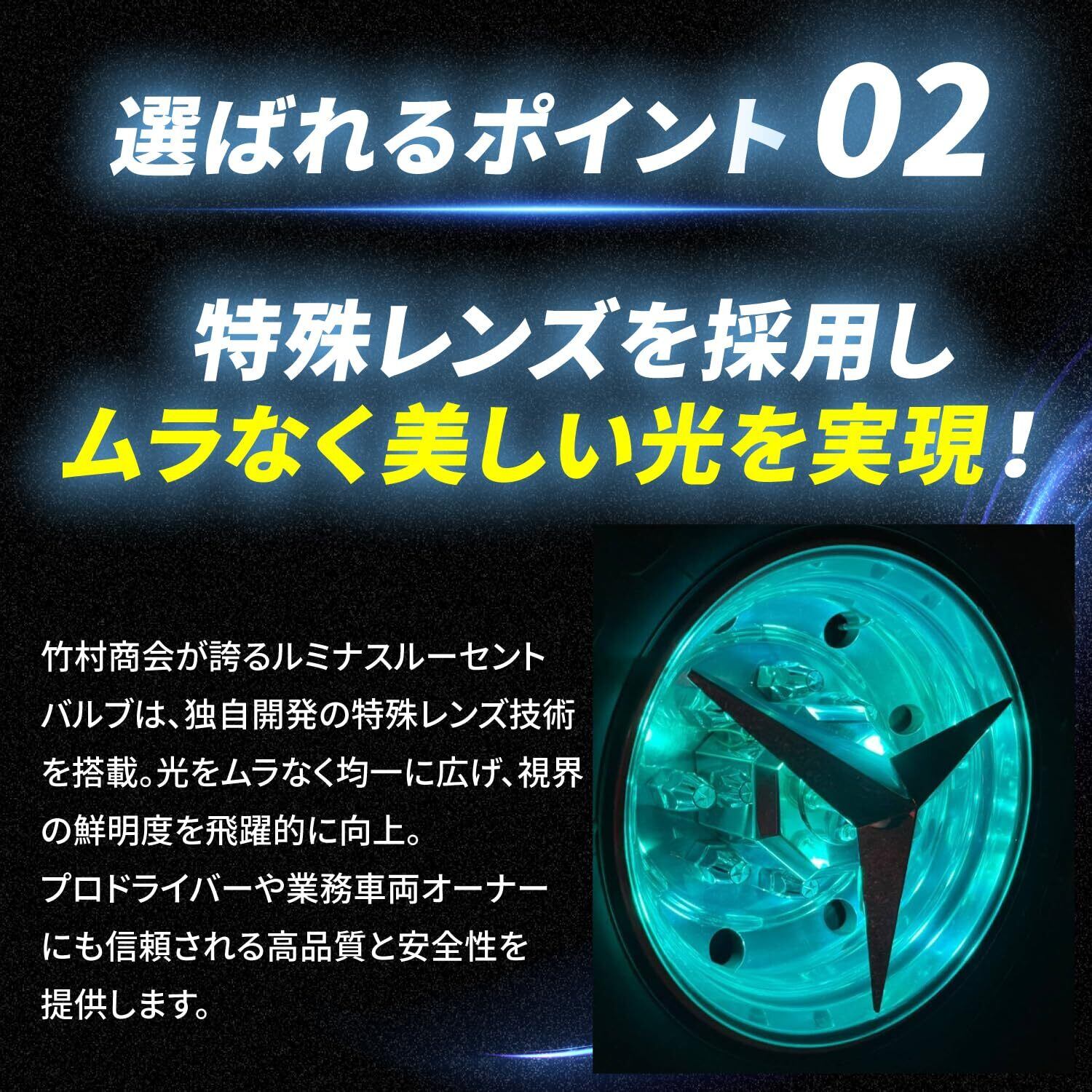 【特殊レンズを採用しムラなく美しい光を実現】竹村商会が誇るルミナスルーセントバルブは、独自開発の特殊レンズ技術を搭載。光をムラなく均一に広げ、視界の鮮明度を飛躍的に向上。プロドライバーや業務車両オーナーにも信頼される高品質と安全性を提供します。
