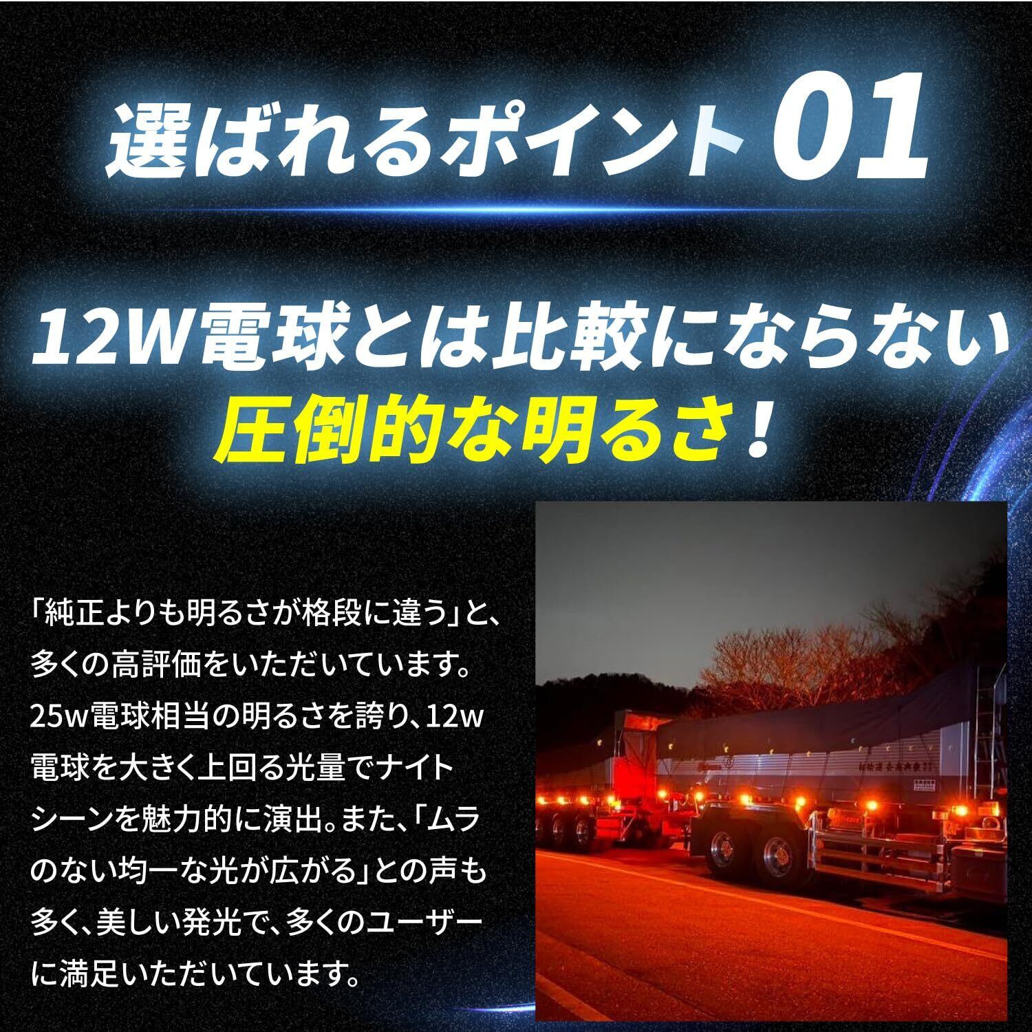 【12w電球とは比較にならない圧倒的な明るさ!】 「純正よりも明るさが格段に違う」と、多くのレビューで高評価をいただいています。25w電球相当の明るさを誇り、12w電球を大きく上回る光量でナイトシーンを魅力的に演出。また、「ムラのない均一な光が広がる」との声も多く、美しい発光で、多くのユーザーに満足いただいています。