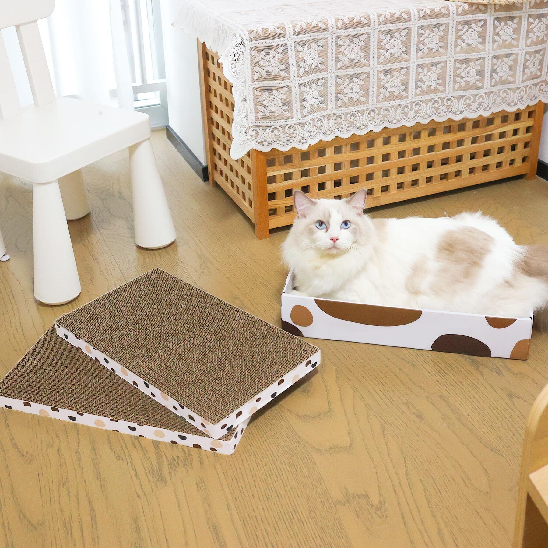 【経済的な枚数】パッケージには3枚の高密度の段ボールが含まれます。一面はボロボロになった場合、新鮮な表面に反転することができ、猫は別の面を使えます。そのため、猫用つめとぎを頻繁に交換する必要がなくなり、猫爪とぎの使用時間が長くなり、交換コストも削減されます。