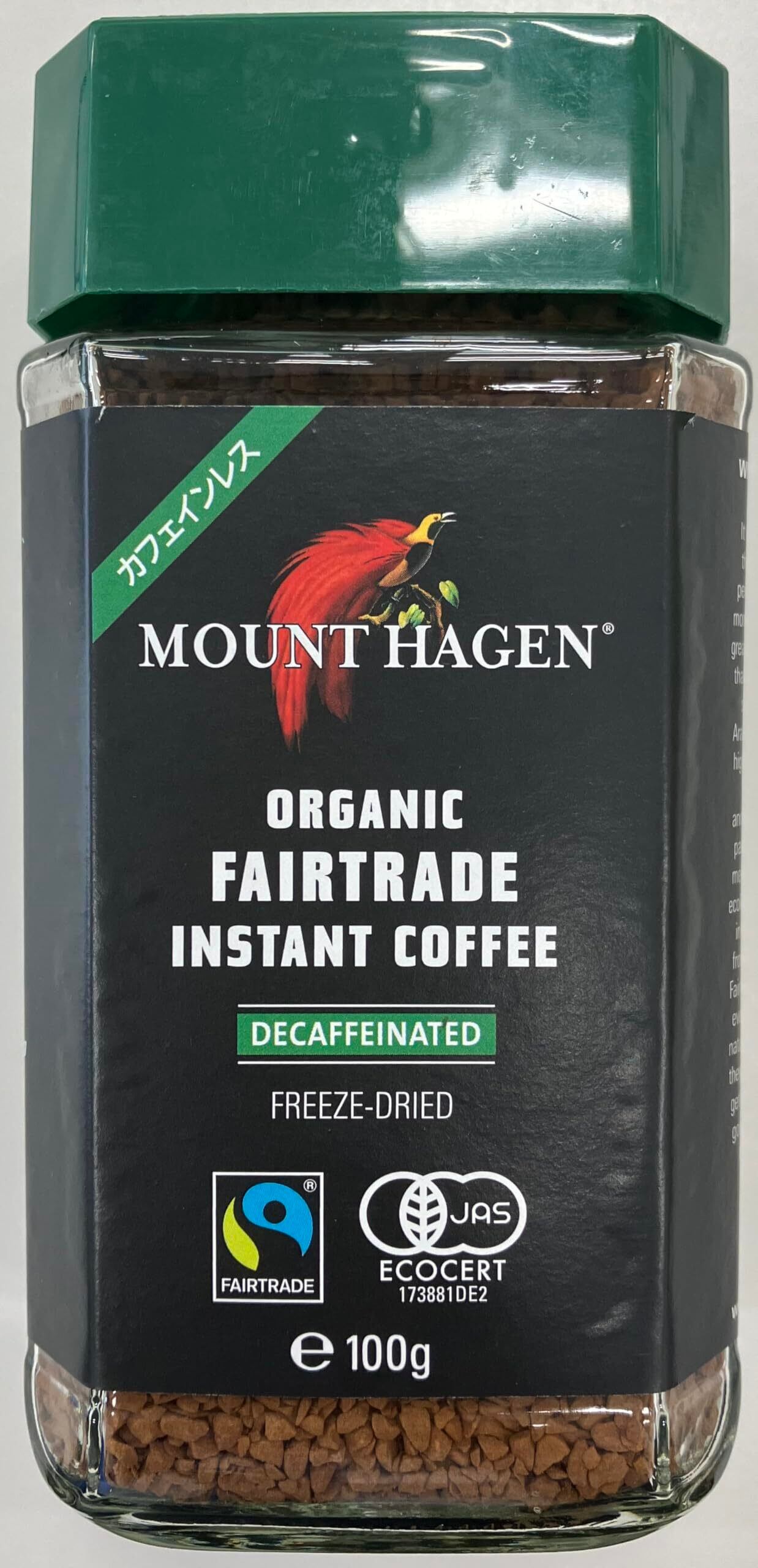 高地有機栽培のアラビカ種コーヒー豆100%ブレンドです。自然なカフェイン除去プロセスにより本来の深く豊かな味と香りをそのまま残しています。カフェイン残留率0.3%未満。欧米で特許を持つ天然の液体CO2と水だけでカフェインを除去する方法(いわゆる超臨界二酸化炭素抽出法)の採用により、本来の深く豊かな味と香りをそのまま残しています。新たにフェアトレード認証を取得。 MOUNT HAGEN(マウントハーゲン)のオーガニックコーヒーは、焙煎コーヒーもインスタントコーヒーも伝統的有機農法で栽培され、手摘みされた極上の高地栽培コーヒー豆のみを使用しています。 ゆっくりと丁寧なローストが、オリジナルの豆本来のバランスのとれた豊かな香りを生み出します。 最新の自然工法により、フリーズドライでありながら本格的な味わいを楽しめます。 有機農法の利用により、カフェイン抜きのインスタントコーヒーであっても本来の香りをそのまま残すことができ、深い味わいと体にやさしいという二重の喜びを提供します。 深く豊かな香りを持つ高地有機栽培の最高品質アラビカ種100%のブレンドです。 欧米で特許を持つ天然の液体二酸化炭素と水だけでカフェインを除去する方法(いわゆる超臨界二酸化炭素抽出法)の採用により、本来の深く豊かな味と香りをそのまま残しています。カフェイン残留率0.3%未満。